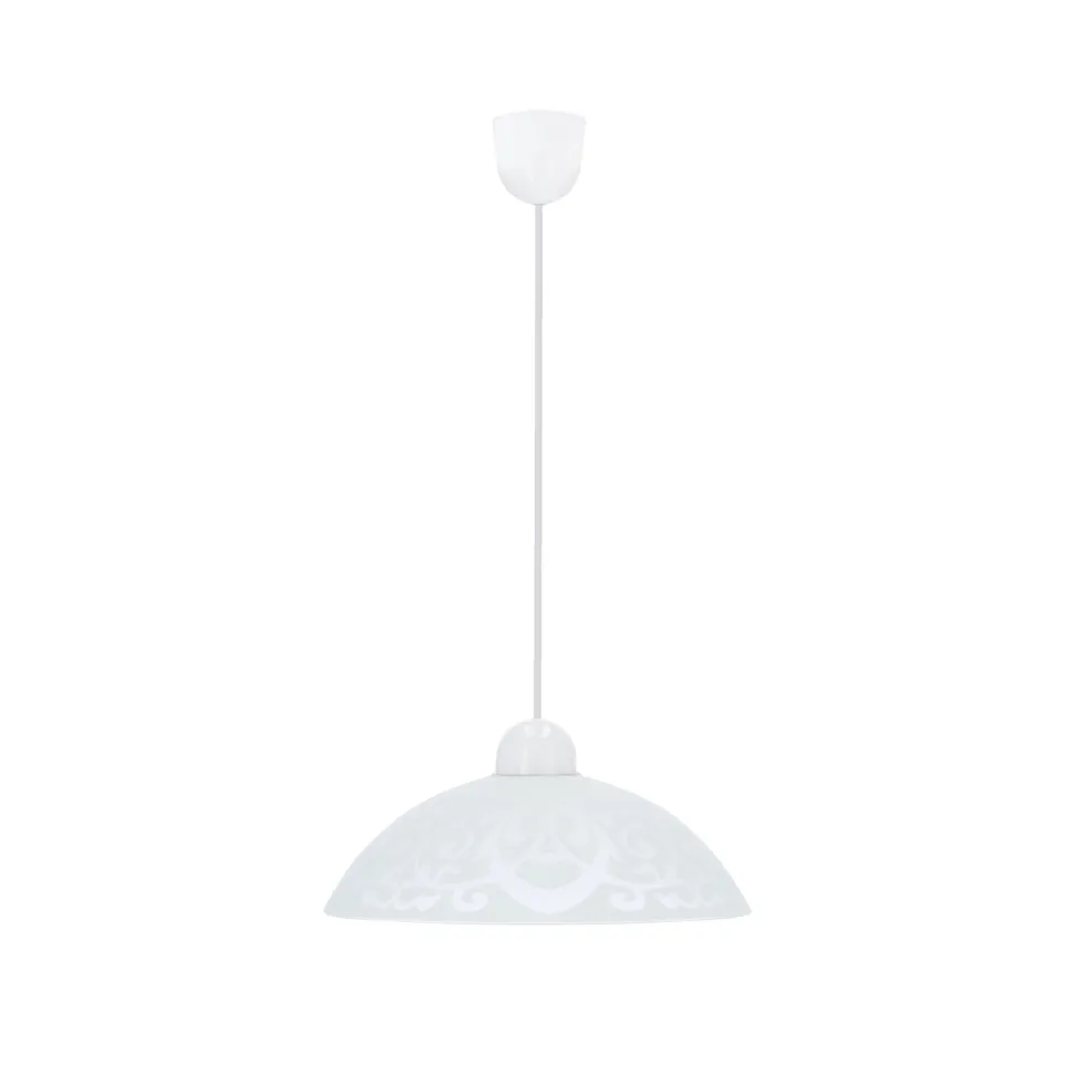- Biały kolor lampy i jej klasyczny design z subtelnym wzorem na kloszu dodają elegancji i uroku każdemu pomieszczeniu.