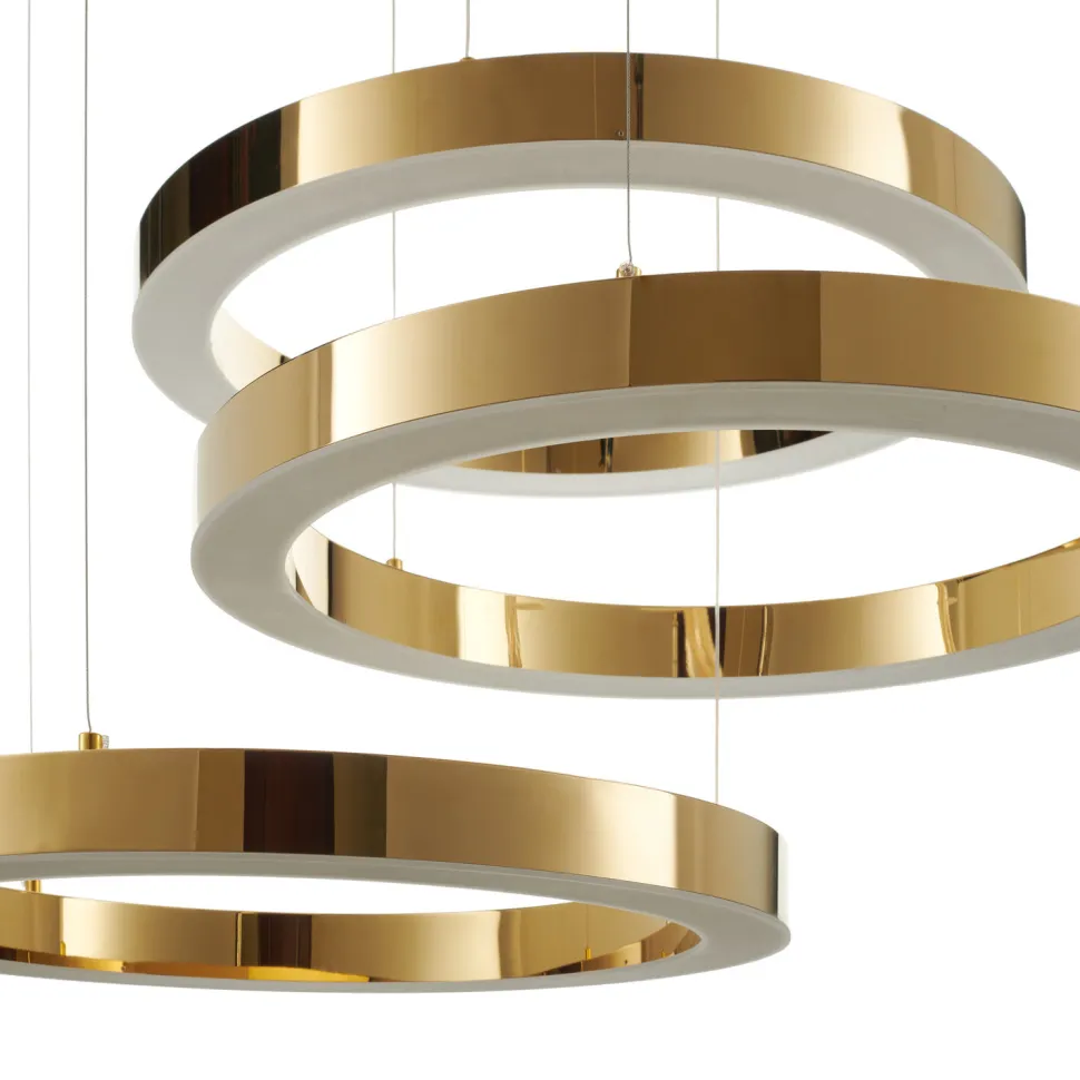 Złoty blask, luksusowy design i energooszczędne oświetlenie LED – to wszystko łączy w sobie lampa wisząca CIRCLE 60+60+60 LED. Składająca się z trzech okręgów o średnicy 60 cm, lampa doskonale oświetli każdą przestrzeń, nadając jej wyjątkowego charakteru. Złote wykończenie dodaje elegancji, a mleczna osłona zapewnia przyjemne, ciepłe światło o temperaturze 3000K.