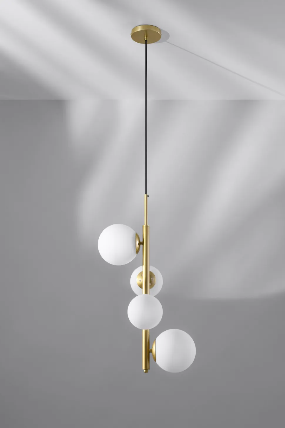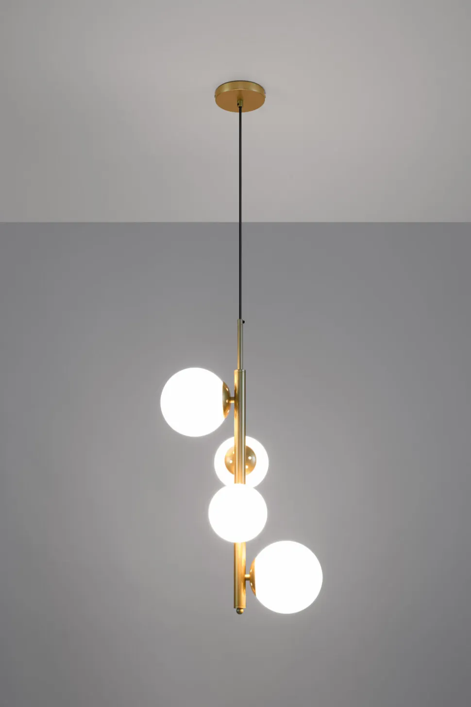 - Złoty kolor lampy Cordel dodaje jej blasku i elegancji, a białe klosze wprowadzają do wnętrza subtelności i lekkości