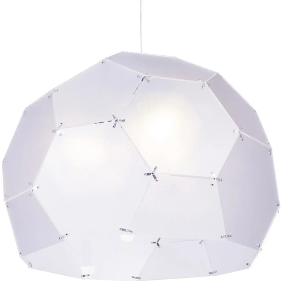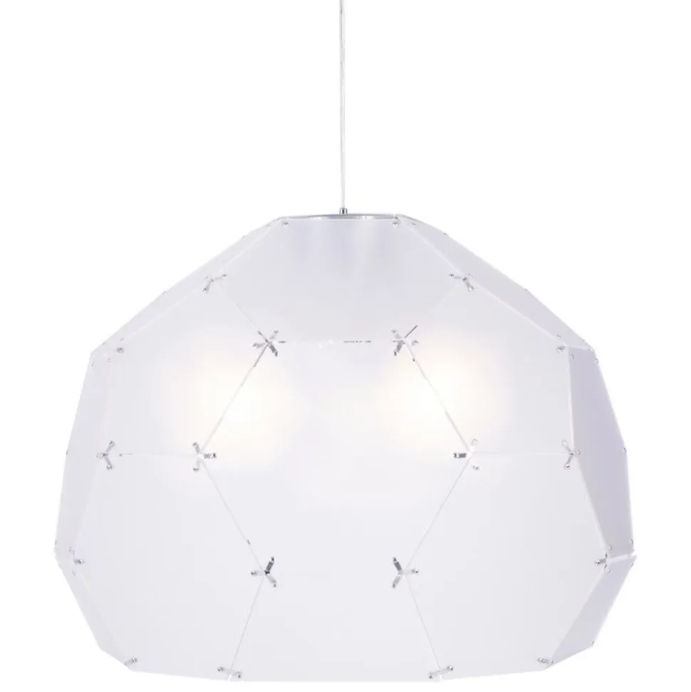 Duża lampa wisząca składająca się z akrylowych sześcianów, swym kształtem przypomina kopułę połączoną metalowymi elementami.