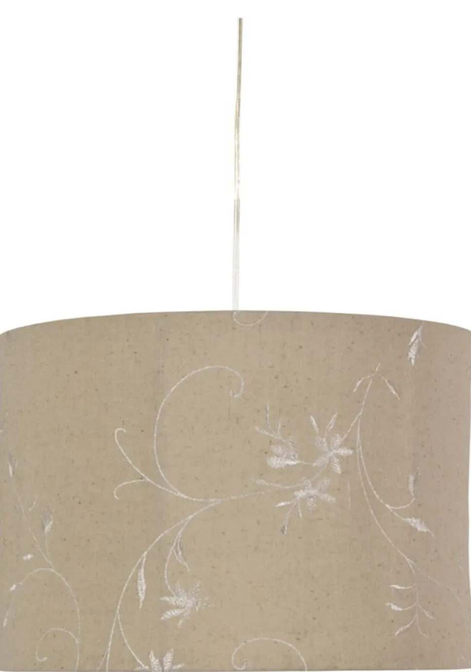 jedyny w swoim rodzaju element stylu ludowego we współczesnym mieszkaniu, zapewniający uzupełnienie dekoracji oraz typowej funkcji zwisu pojedynczego; abażur wykonany z tkaniny lnianej z roślinnym motywem; zawieszony na standardowym plastikowym zawiesiu w kolorze białym