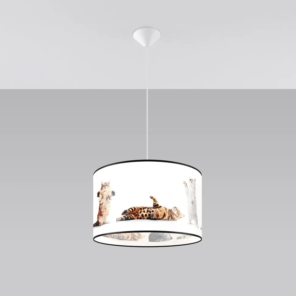 - Abażur zdobią urocze wizerunki kotków, które wprowadzą przytulny nastrój do pokoju dziecięcego.