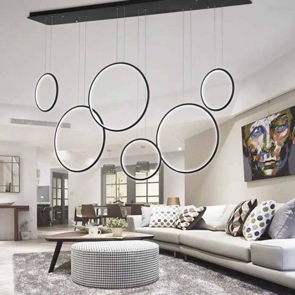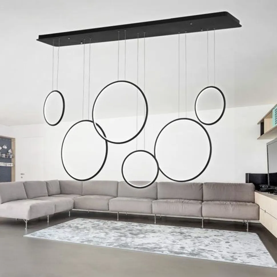 LEDowe Okręgi marki Altavola Design to lampa, z jednej strony zachwycająca prostotą formy jej geometrycznych abażurów, a z drugiej strony przewrotnie przykuwająca wzrok swym wyrafinowaniem. Ta ultranowoczesna lampa skrywa w sobie technologię SMD LED, co czyni z niej również oświetlenie energooszczędne. Delikatne aluminiowo-sylikonowe okręgi świecą mocnym, bardzo przyjaznym naturalnym światłem. Oznacza to, że lampa świetnie sprawdzą się zarówno we wnętrzach mieszkalnych, jak i biurach oraz hotelach. Maksymalna długość zawieszenie okręgów mierzona od podsufitki to 197 cm. Kolor: Czarny Materiał: aluminium, silikon