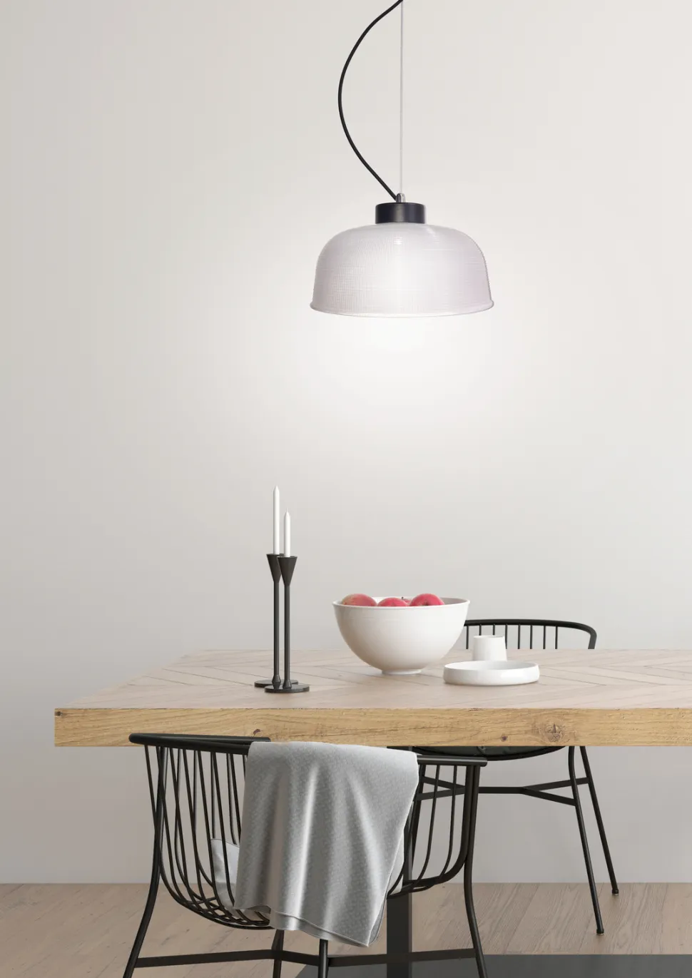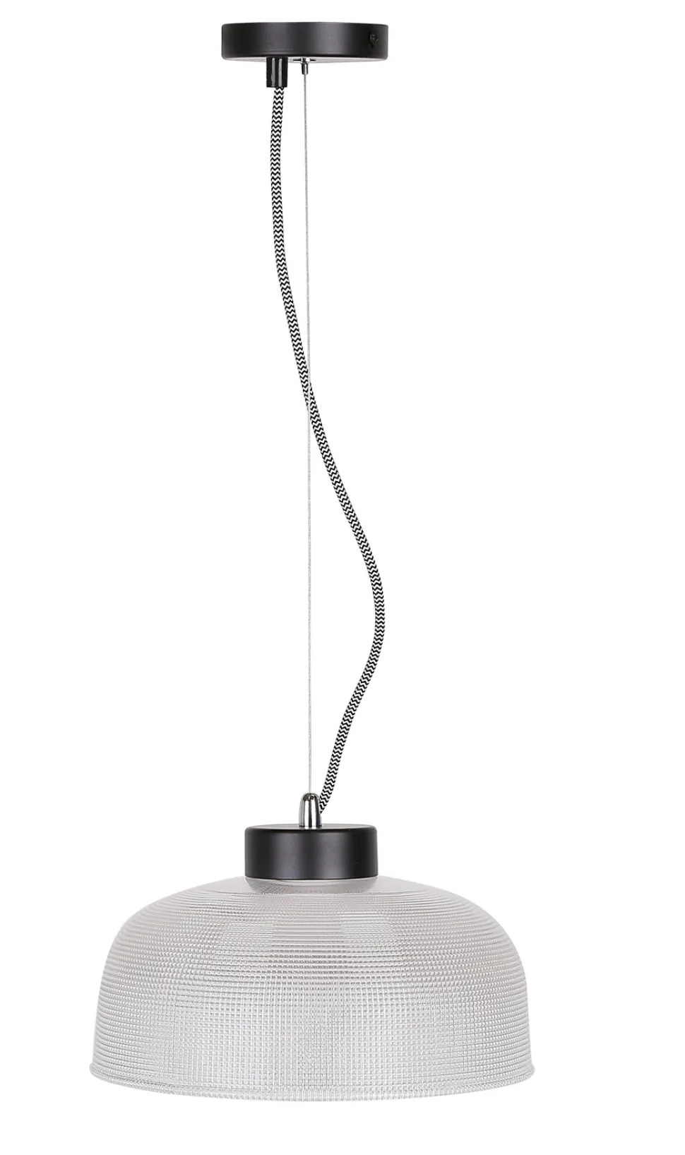 Seria czterech lamp wiszących z ryflowanym kloszem, inspirowanych stylistyką lat 70. Lampy występują w dwóch świetnicach klosza i dwóch kolorach kabla. Idealnie pasują do klasycznych i eklektycznych wnętrz, do pomieszczeń takich jak salon, kuchnia, jadalnia, sypialnia gabinet, przedpokój. Lampa wisząca o średnicy 27 cm z czarnym kablem i jednym punktem świetlnym. Żarówka nie jest dołączana dla produktów z zewnętrznym źródłem światła.