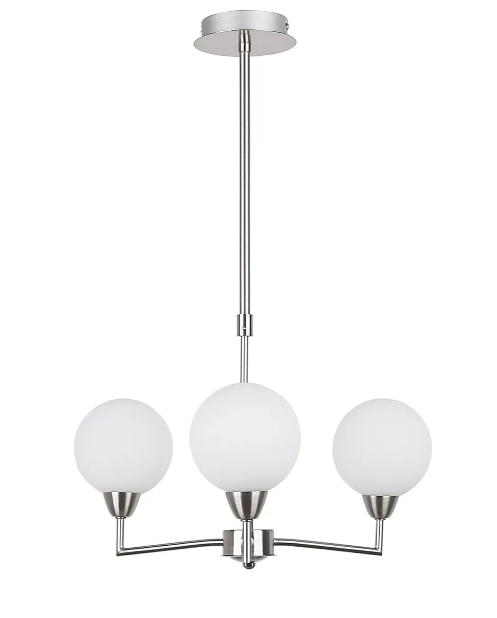 - Wykończenie lampy to satyna, a jej klosze są białe.