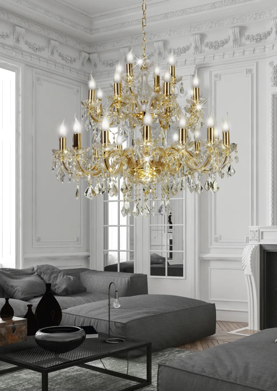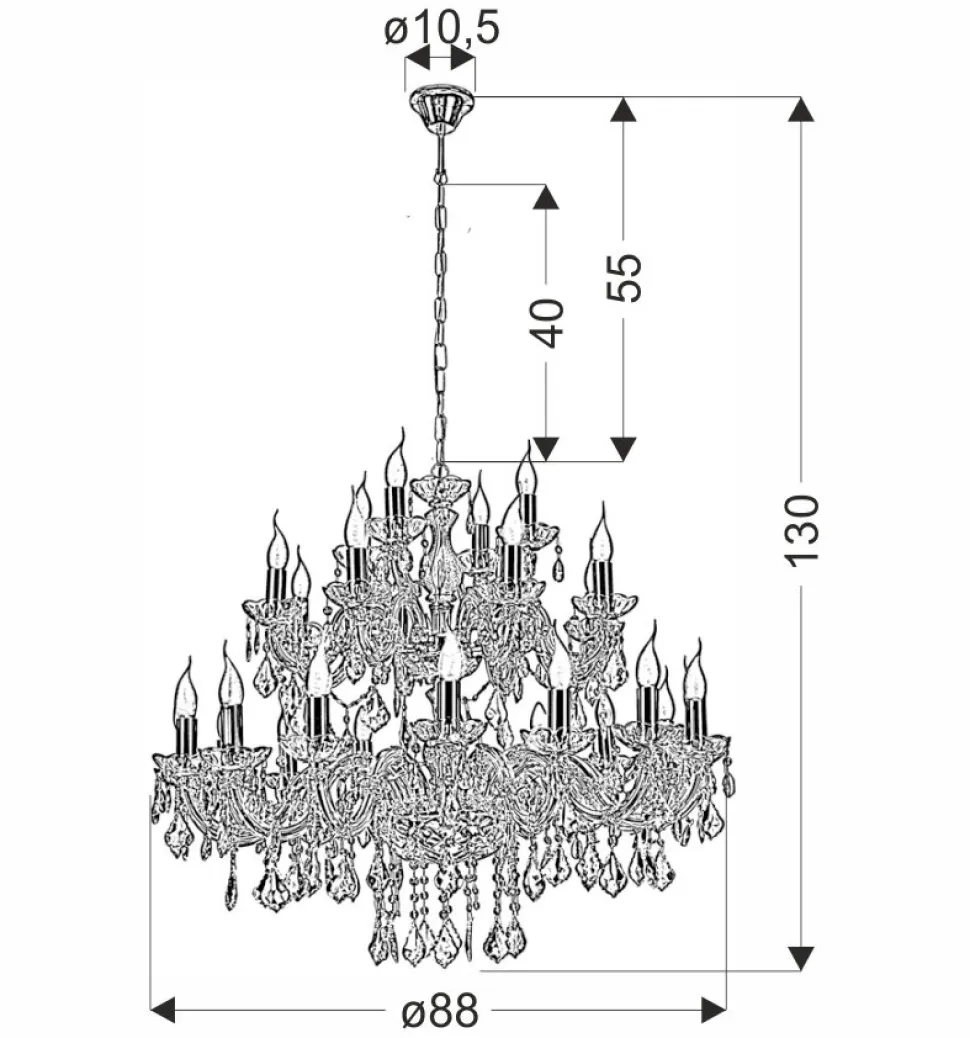 Prezentowany model lampy wiszącej Maria Teresa 28x40W E14 to prawdziwy klejnot wśród lamp sufitowych. Wykonana z połączenia metalu, tworzywa i kryształu, jest symbolem luksusu i elegancji. Jej złoty kolor dodaje wnętrzom blasku i prestiżu. Lampa jest zawieszona na solidnym łańcuchu, który umożliwia regulację wysokości, dostosowując ją do indywidualnych potrzeb.