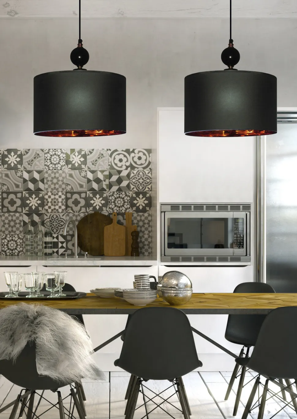 Kolorystyka lampy Melba to połączenie czerni i miedzi, co czyni ją wyjątkowym dodatkiem do pomieszczeń urządzonych w różnych stylach. Czarna oprawa i miedziane wnętrze abażura tworzą elegancki i nowoczesny kontrast, który przyciąga wzrok i dodaje pomieszczeniu charakteru.