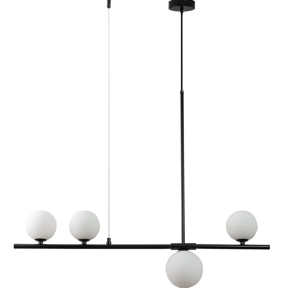 Zaaranżuj swoje wnętrze z lampą wiszącą MODERNO. Jej minimalistyczny design, połączony z czarnym wykończeniem, tworzy niezwykle efektowny kontrast, który podkreśli charakter każdego pomieszczenia. Szklane klosze dodają lampie elegancji, a okrągła podsufitka w kolorze czarnym zapewnia stabilność i bezpieczeństwo.