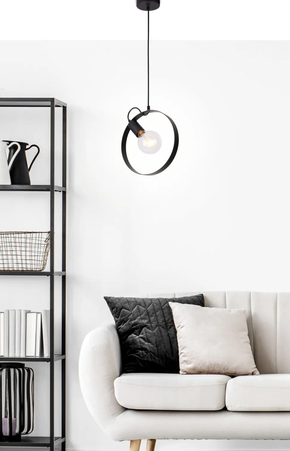 Seria prostych, metalowych lamp inspirowanych stylem skandynawskim, wykonanych z metalu w trzech wariantach kolorstycznych: białym, czarnym i różowym. W skład rodziny wchodzą: lampa wisząca i stołowa. Produkty z rodziny będą idealnie komponować się w pomieszczeniach, takich jak: salon, jadalnia, kuchnia, sypialnia, gabinet, pokól dziecięcy, pokój młodzieżowy. Lampa wisząca w kolorze czarnym z jednym źródłem światła. Żarówka nie jest dołączona do produktów z zewnętrznym źródłem światła.