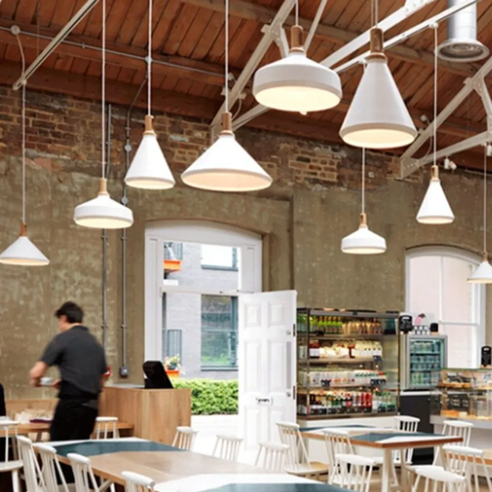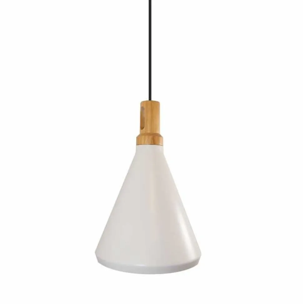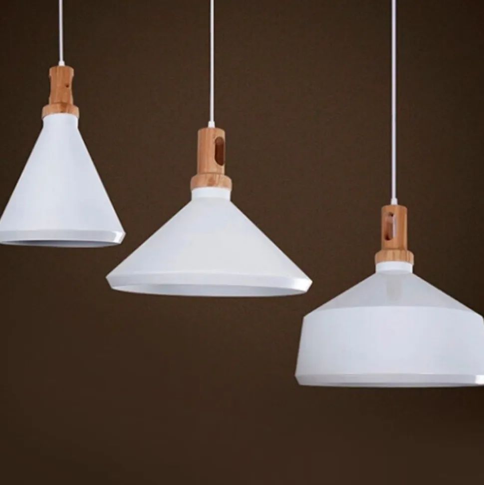 Biały kloszz aluminium malowanego proszkowowykończony jest prawdziwym drewnem.