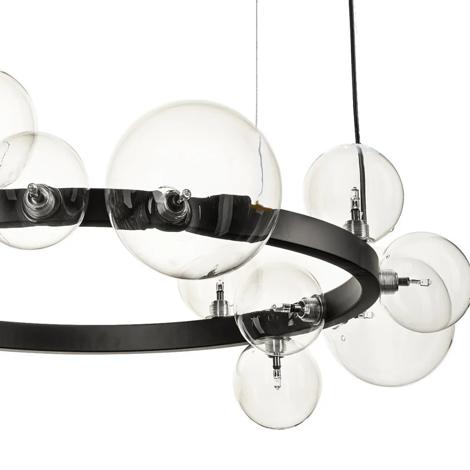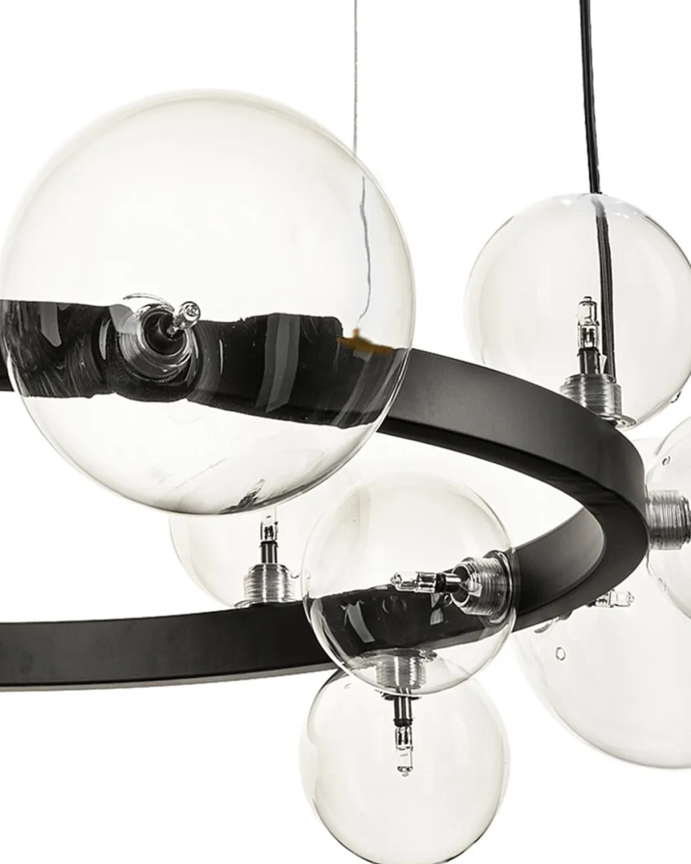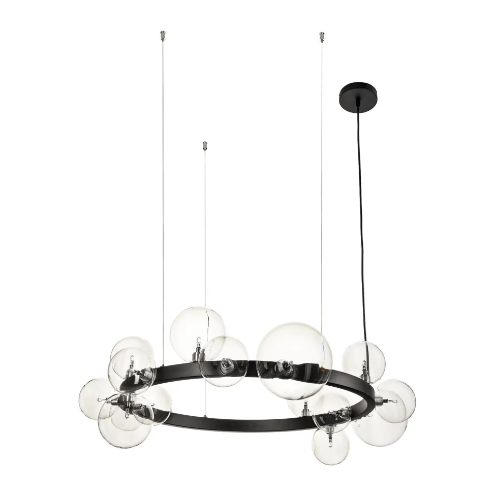 Dekoracyjna lampa wisząca ORION na bazie okręgu zwieńczona jest piętnastoma szklanymi kulami o różnej wielkości.
