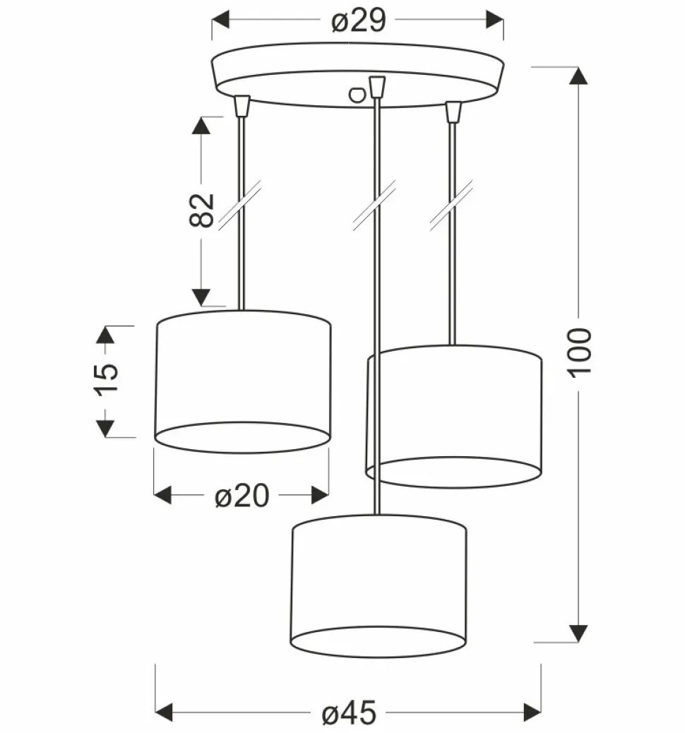 - Lampa wisząca PANDY posiada trzy oprawki żarówkowe E27 o mocy do 40W.