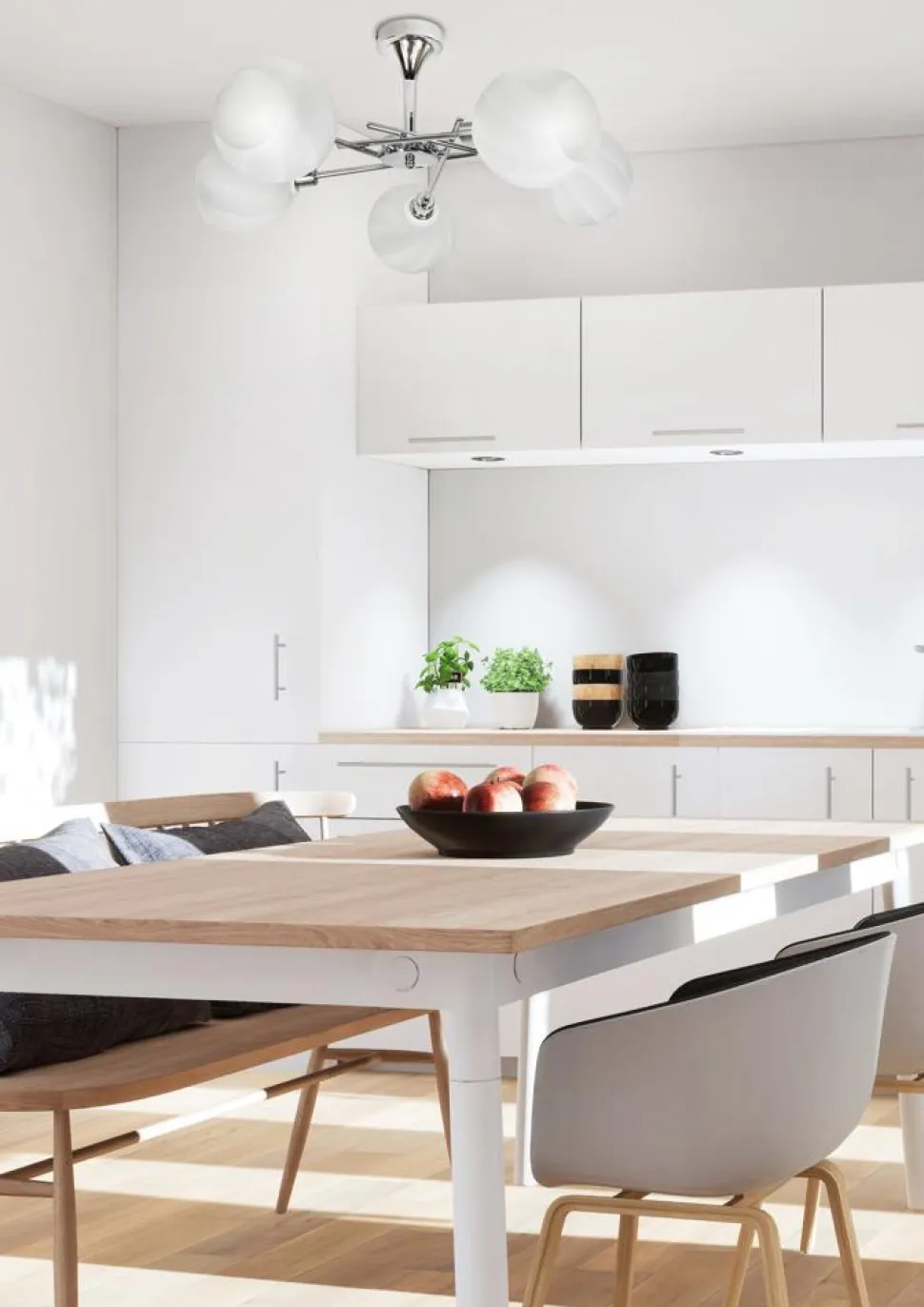 - Stylowa, chromowana oprawa i białe klosze dodają lampie elegancji i sprawiają, że staje się ciekawym elementem dekoracyjnym.