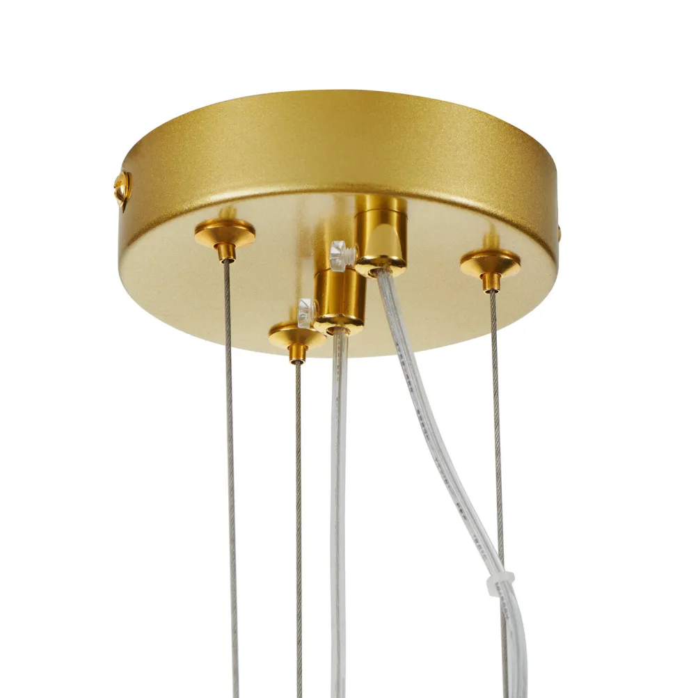 Prezentujemy Państwu lampę wiszącą SUSSO S, która jest prawdziwym dziełem sztuki. Wykonana z metalu, posiada unikalną konstrukcję przypominającą drucianą siatkę, która tworzy ciekawy efekt świetlny. Dwa źródła światła, umieszczone jeden na drugim, emitują ciepłe światło, które subtelnie rozprasza się po pomieszczeniu. Lampa jest zawieszona na transparentnym kablu i stalowych linkach, co dodaje jej nowoczesnego charakteru. Dostępna w złotym kolorze, może być również zamówiona w wersji czarnej.
