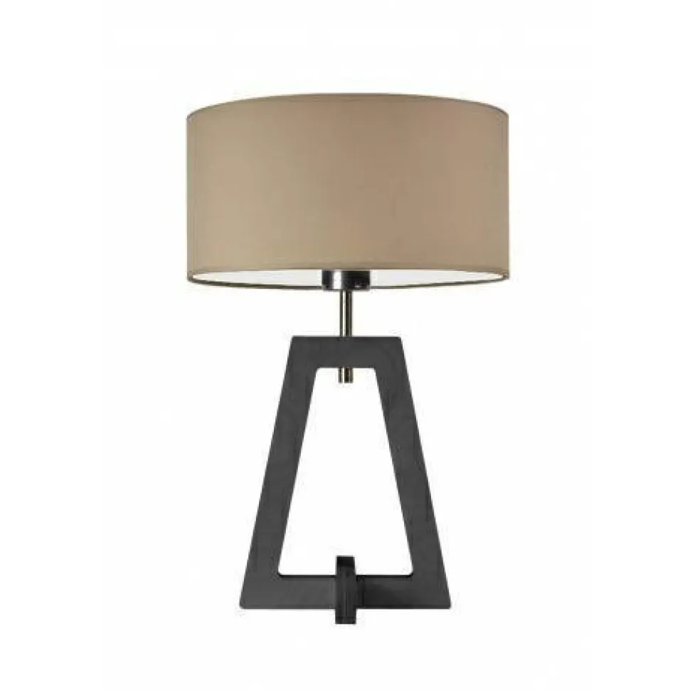 Lampka Clio wyróżnia się ciekawą konstrukcją, tworzoną przez podstawę w kształcie trapezu i tkaninowy abażur.