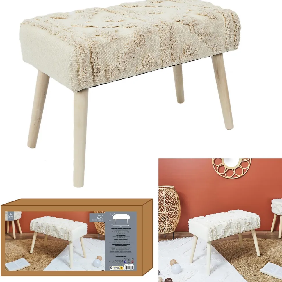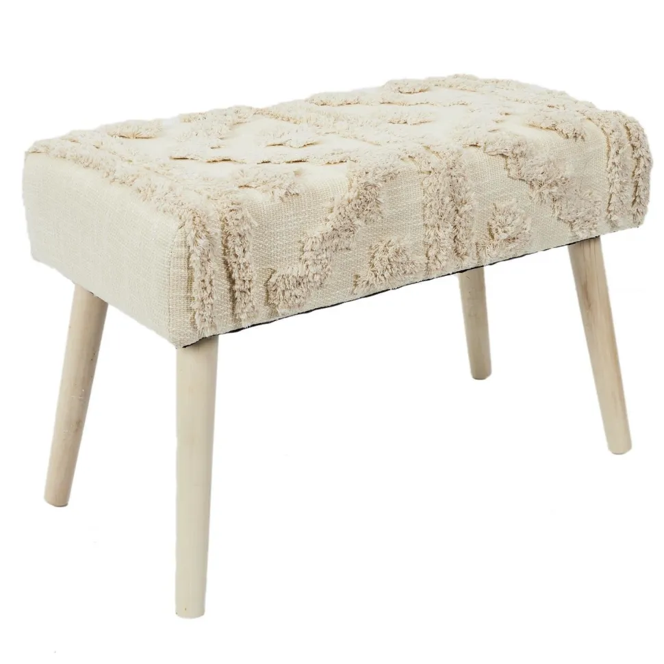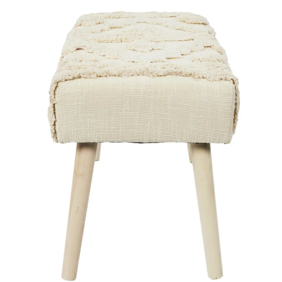 Drewniana ławka w stylu boho to urokliwy element do wnętrz przytulnych i naturalnych. Miękkie siedzisko wykończone kremową tkaniną o wyplatanych wzorach to nie tylko praktyczne rozwiązanie, ale i ciekawa dekoracja. Miękka pianka tapicerska zapewnia wygodę podczas siedzenia, a rozmiar ławki wpasuje się nawet do niewielkich wnętrz. Sosnowe nóżki oraz ozdobne wzory ławki bohonawiązują do klimatupozostałych mebli z kolekcji Bali. Wysokiej jakości wykonanie i estetyczne wykończenie sprawia, że jest to mebel idealny.