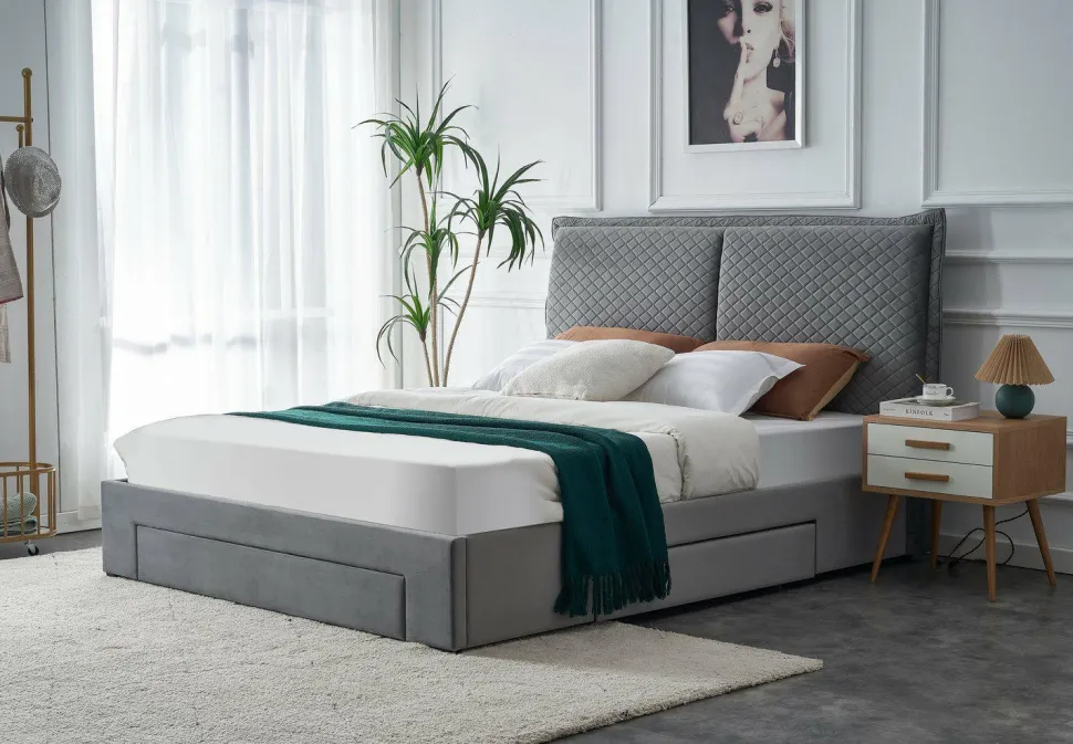 Pikowane wezgłowie w szarej welwetowej tkaninie dodaje łóżku niepowtarzalnego stylu, a pojemniki na pościel umieszczone w formie szuflad z kółkami pozwalają na łatwe i wygodne schowanie pościeli i koca. Dzięki temu Twoja sypialnia będzie zawsze schludna i uporządkowana. Łóżko wykonane jest z litego drewna, co gwarantuje jego trwałość i stabilność. Wysokość ramy wynosi 33cm, a wysokość wezgłowia to aż 120cm, co pozwala na wygodne oparcie podczas czytania książki lub oglądania filmu.