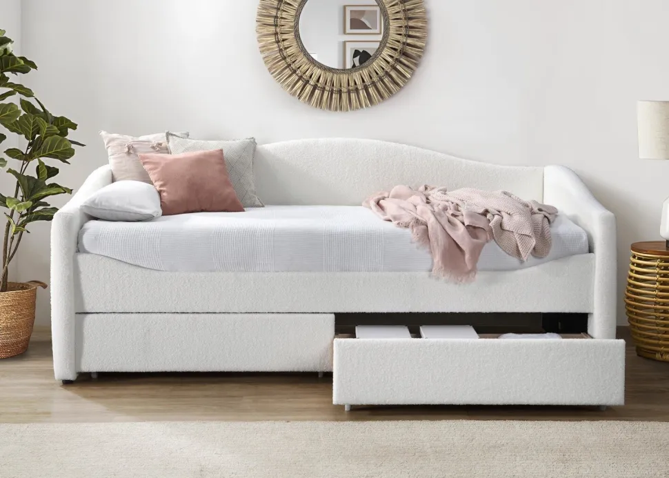 Łóżko Elbert o szerokości 90 cm w kolorze kremowym to stylowe i funkcjonalne rozwiązanie do każdego wnętrza, które łączy w sobie estetykę i wygodę. Wykonane z miękkiej, przyjemnej w dotyku tkaniny boucle, łóżko emanuje ciepłem i przytulnością, wprowadzając do sypialni spokojną, relaksującą atmosferę. Jego kremowy kolor doskonale wpisuje się w nowoczesne i klasyczne aranżacje, nadając wnętrzu elegancji i lekkości.