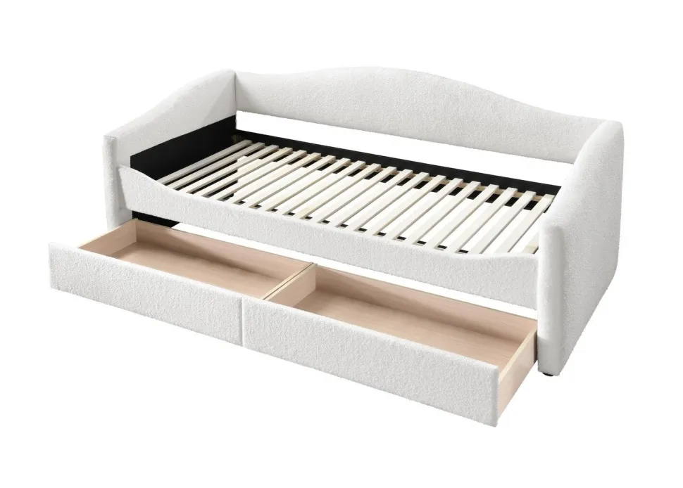 - Łóżko Elbert wyróżnia się nowoczesnym i eleganckim wyglądem, dzięki tkaninie boucle w kremowym kolorze