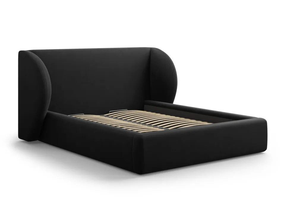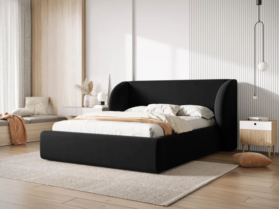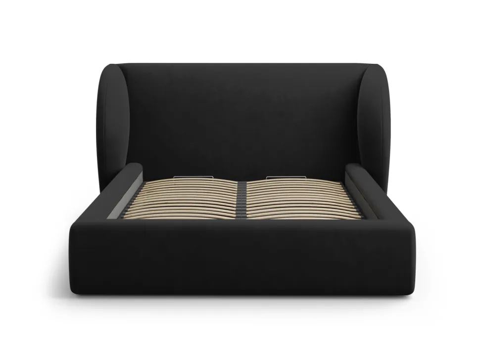 Materiał: Furniture Board, Metal Frame with Flexible Plywood Slats, Natural Wood Elements, Technical Nonwoven Fabric, Metal Furniture Fittings, Black Plastic Legs It is recommended to clean the entire sofa with a soft brush. Avoid strong friction or sudden vigorous movements. Do not use a vacuum cleaner. The covers for the entire product range are not removable. Their removal and washing in a washing machine is at the customer’s own risk – this will not provide the grounds to initiate a complaint procedure. The upholstery of the sofa, especially in light colours, is exposed to dyeing by other fabrics, mainly by clothing, such as denim jeans. This is not a defect of the upholstery, but a defect of the clothing fabric. The so-called peeling of the fabric is also caused by contact with foreign fibres (clothing or bedspreads). Metal and wooden parts should not be exposed to a long-lasting contact with water. If necessary, they should be wiped with a damp cloth, using neutral detergents (do not use bleach, soap for hard surfaces or ammonia-containing agents). Any residue from the cleaning agents should be wiped dry. To clean wet or greasy stains, use tissue paper followed by a damp, soft sponge to quickly absorb the stain. Then you may proceed to the stain removal using a neutral cleaning agent and water. Clean dirty surfaces with gentle, circular movements from the outside to the inside, avoiding vigorous rubbing of wet fibres. After removing the stain, the fabric should be left to dry in room temperature. Repeat if necessary, widening the area around the stained spot to reduce the circular effect. Before cleaning, we recommend that you test the cleaning agent on a hidden part of the sofa to avoid damaging the fabric. To extend the life of the fabric, we recommend that you protect the surface from pets. Polyurethane Foam 25 kg/m³ Łóżko Miley II Black Velvet 140×200