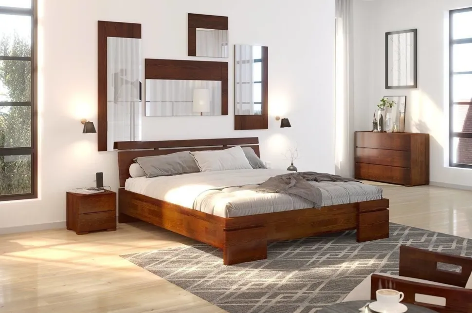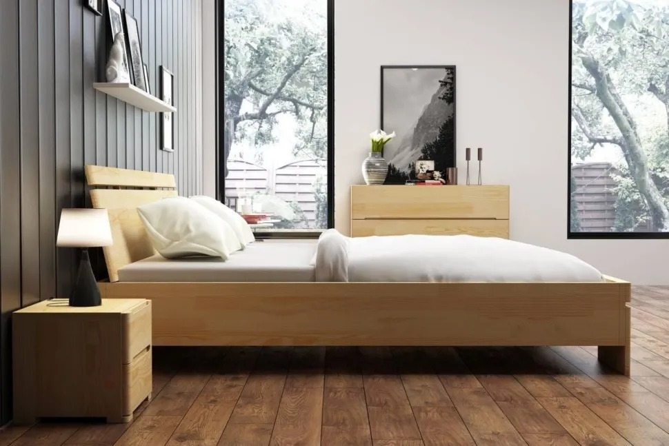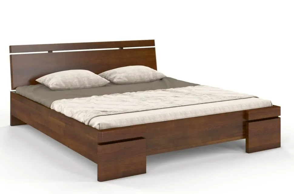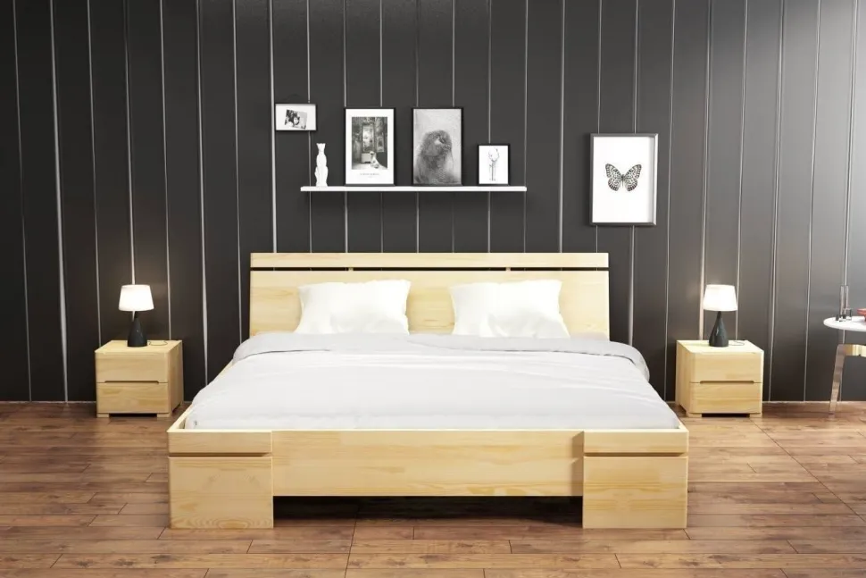 Łóżko SPARTA to łóżko wysokie – jego wysokość wynosi 86 cm, co znacząco ułatwia wstawanie z niego. Duża wysokość jest także niezastąpionym sprzymierzeńcem w trosce o czystość. Frontową część łóżka wieńczą mocne nogi. Nadano im niepowtarzalny wygląd – tworzą je dwa elementy poziome, między którymi znajduje się przestrzeń nadająca łóżku lekkości. W tej samej konwencji zaprojektowany został zagłówek – dodatkowo, dla zwiększenia wygody, został on lekko pochylony. Materiał: lite drewno sosnowe. Kolor drewna: do wyboru ze wzornika. Sposób wykończenia drewna: dwukrotne szlifowanie + bejca + 2 warstwy lakieru. Drewno łączone na „mikrowczepy” – dzięki temu pozbawione jest ono skaz i sęków po widocznej stronie, a co najważniejsze, jest bardziej wytrzymałe na uszkodzenia i działanie wilgoci – wykazuje lepsze właściwości mechaniczne w stosunku do drewna litego i nie wypacza się. „Piąta” noga wzmacniająca konstrukcję łóżka.