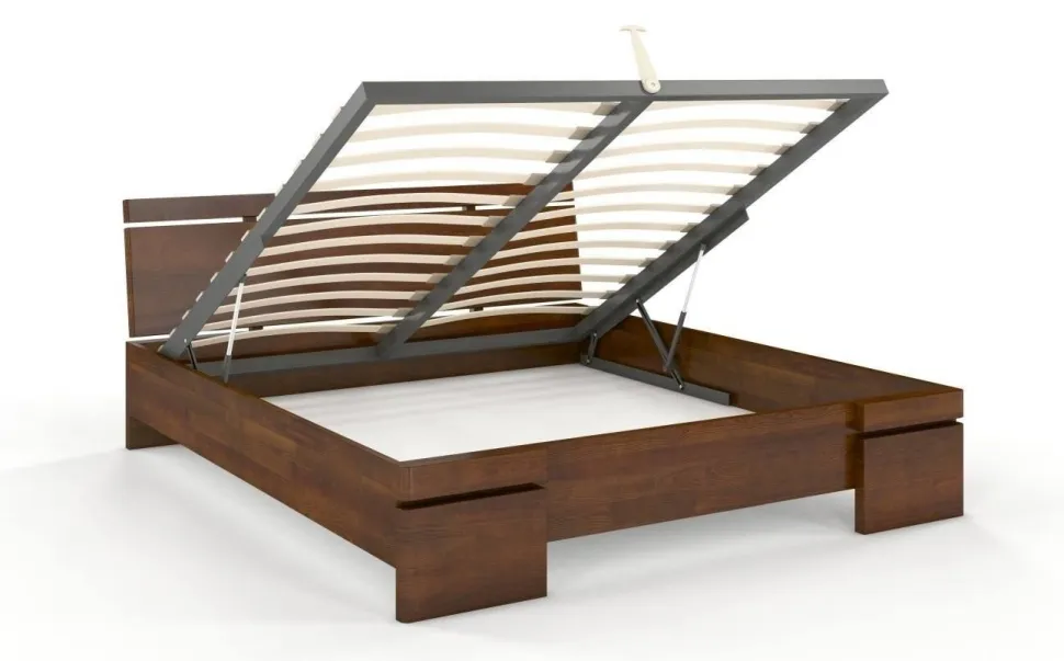 To mebel elegancki, który dopracowany został w każdym szczególe, czego potwierdzeniem są dopracowane detale. Łóżko SPARTA to łóżko wysokie – jego wysokość wynosi 86 cm. Jednym z nich jest wysokość mebla. Jeśli męczył Cię wysiłek podczas wstawania, z łóżka Sparta wystarczy zrzucić nogi na podłogę – wstawanie odbywa się bez trudu. Ukłonem w stronę wygody użytkowania jest pojemna skrzynia na pościel – z dnem z solidnej płyty HDF i stelażem w formie pokrywy. Dopracowany system otwierania pozwala podnosić stelaż bez najmniejszego trudu. Materiał: lite drewno sosnowe. Kolor drewna: do wyboru ze wzornika. Skrzynia na pościel wraz z metalową ramą. Siłowniki gazowe ułatwiające podnoszenie ramy. Uchwyt z tworzywa do podnoszenia skrzyni w kształcie odwróconej kotwicy. Płyta na dnie skrzyni: moduły dna są ze sobą połączone za pomocą estetycznych listew. Sposób wykończenia drewna: dwukrotne szlifowanie + bejca + 2 warstwy lakieru. „Piąta” noga wzmacniająca.