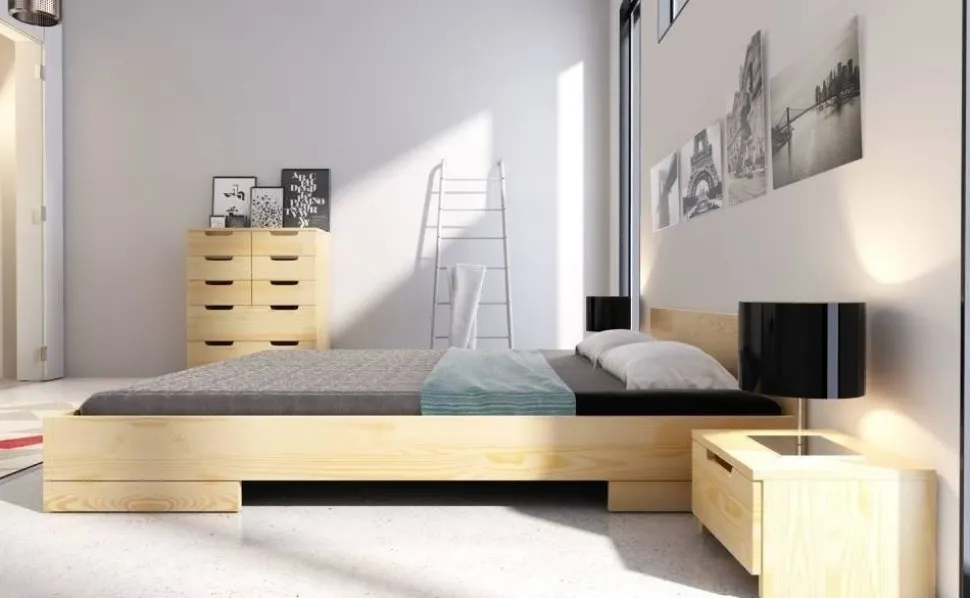 Projektując ten mebel, specjaliści aranżacji postawili na urok prostoty. Piękno łóżka tkwi w skromnym – chciałoby się rzec, ascetycznym – wykończeniu. Pozbawione jest ono zdobień i przepychu. Dodatkowo, łóżko jest dość niskie, aby wpisać się w niewielkie wnętrza, w których ma służyć wygodzie – zdobić, ale nie królować, wysuwając się na pierwszy plan. Solidności dodaje także piąta noga – drewniany wspornik o kształcie litery T wzmacniający konstrukcję łóżka. Materiał: lite drewno sosnowe. Zagłówek: drewno sosnowe. Sposób wykończenia drewna: dwukrotne szlifowanie + bejca + 2 warstwy lakieru. Kolor drewna: do wyboru ze wzornika. Drewno łączone na „mikrowczepy” – dzięki temu pozbawione jest ono skaz i sęków po widocznej stronie, a co najważniejsze, jest bardziej wytrzymałe na uszkodzenia i działanie wilgoci – wykazuje lepsze właściwości mechaniczne w stosunku do drewna litego i nie wypacza się.