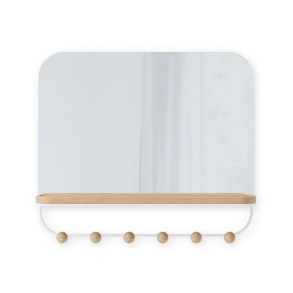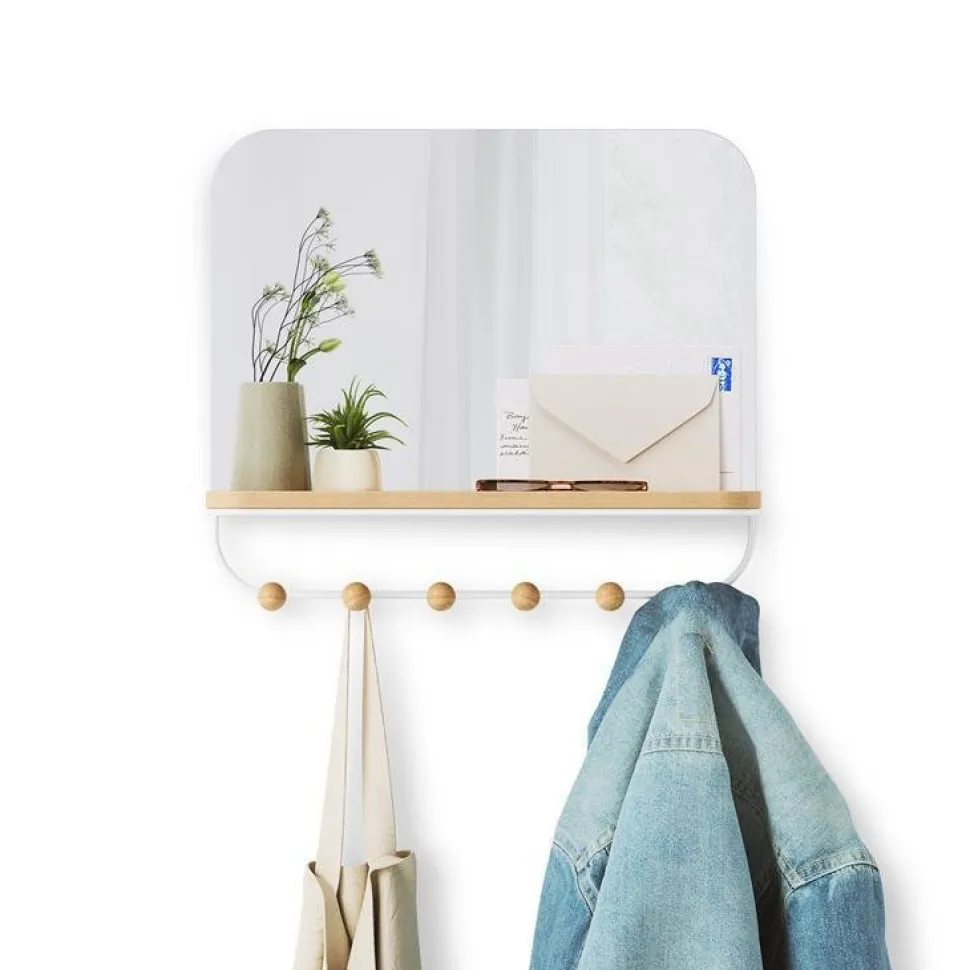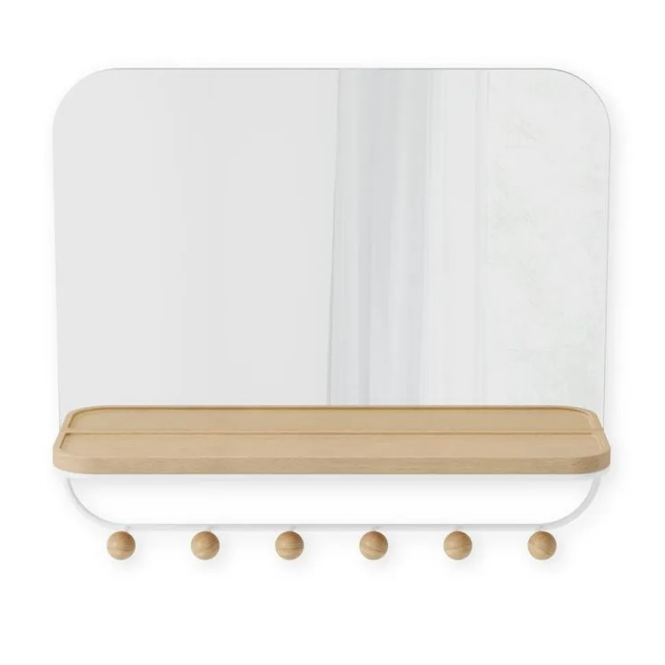 Lustro Estique połączone z półką i poręcznymi wieszakami w formie haczyków to multifunkcjonalny projekt, który idealnie odnajdzie się w Twoim przedpokoju. Ze względu na to, że całość montowana jest do ściany, pozwoli zaoszczędzić sporo miejsca nawet w niedużym mieszkaniu. Średniej wielkości lustro pozwoli przejrzeć się przed wyjściem z mieszkania, a dodatkowa półka posłuży jako miejsce na klucze, okulary i inne przedmioty, które chcesz mieć zawsze pod ręką. Dodatkowo pod lustrem zamontowane zostały haczyki, które z powodzeniem zmieszczą kurtki, szaliki i czapki. Lustro Estique to po prostu wiele funkcji zamkniętych w jednym produkcie, a do tego ubranych w piękną estetyczną formę.