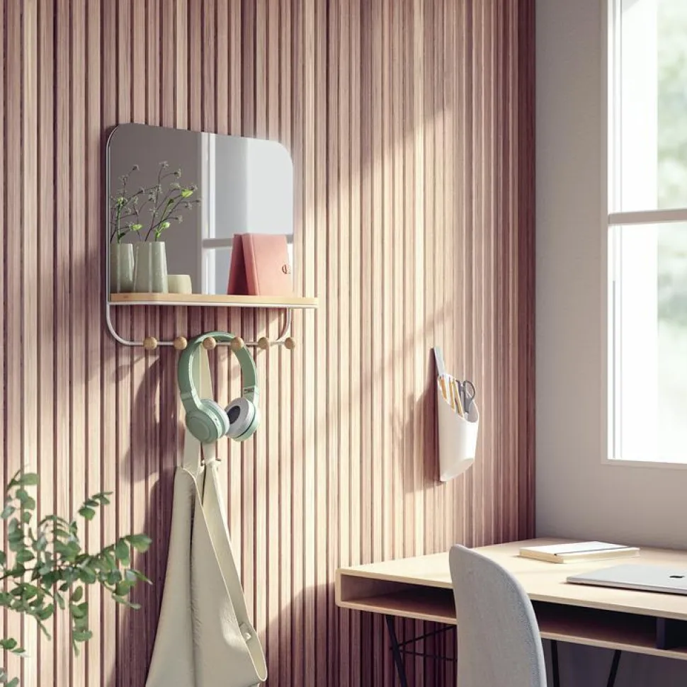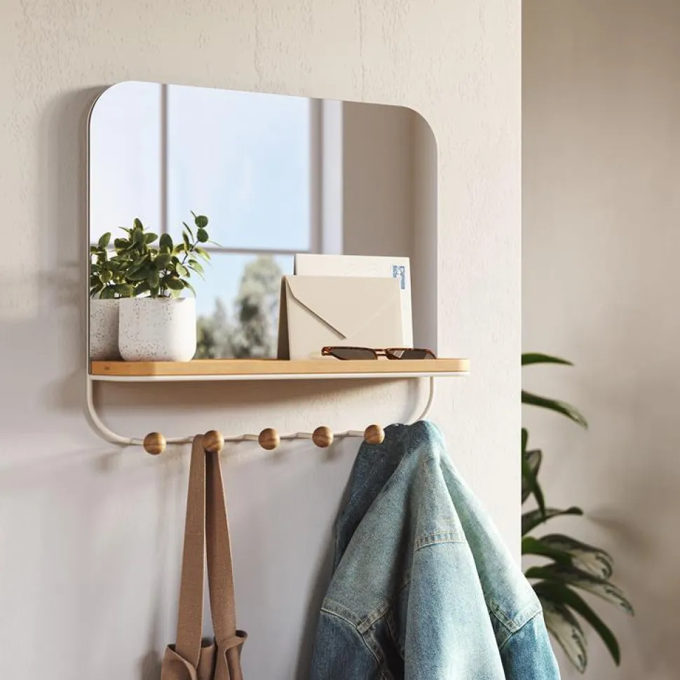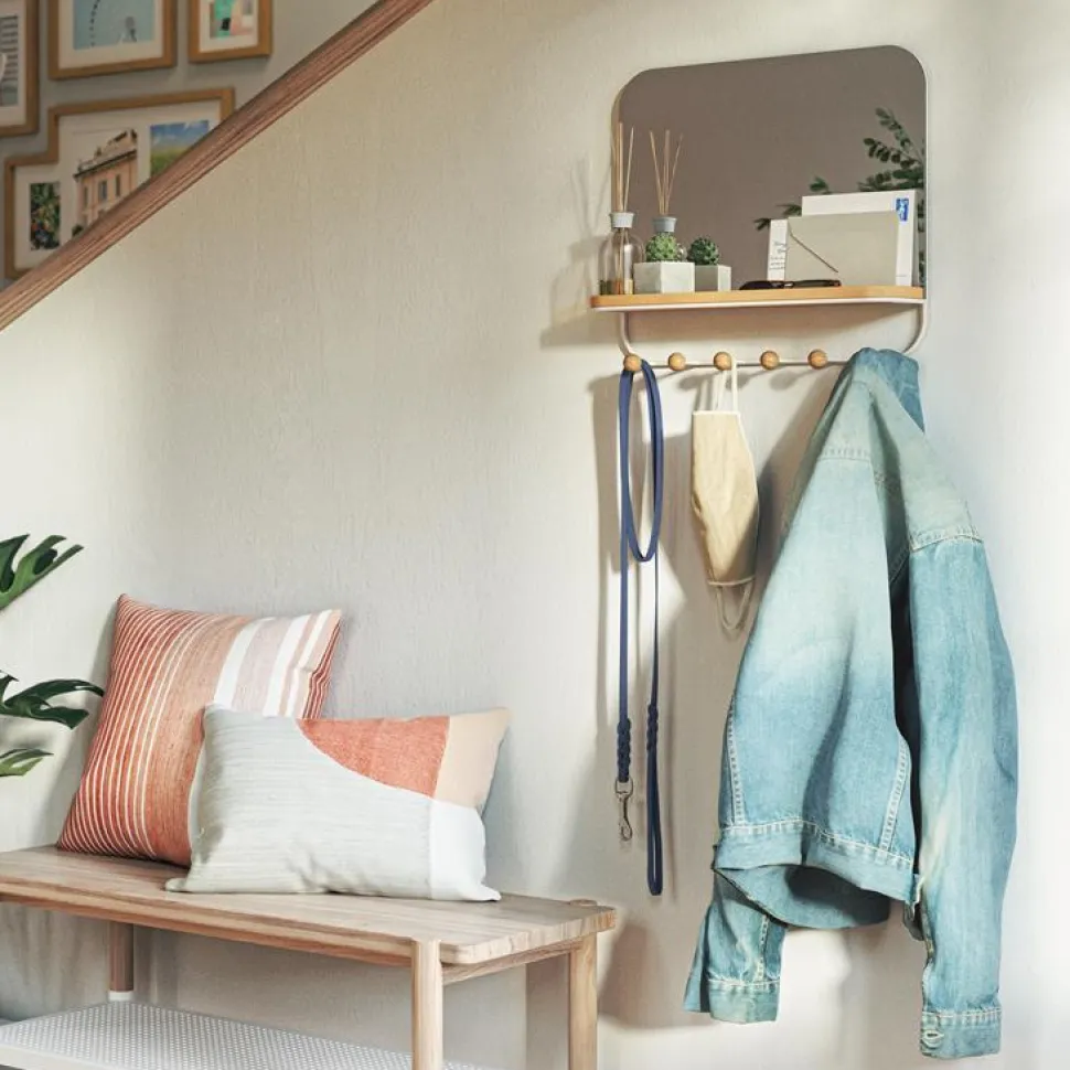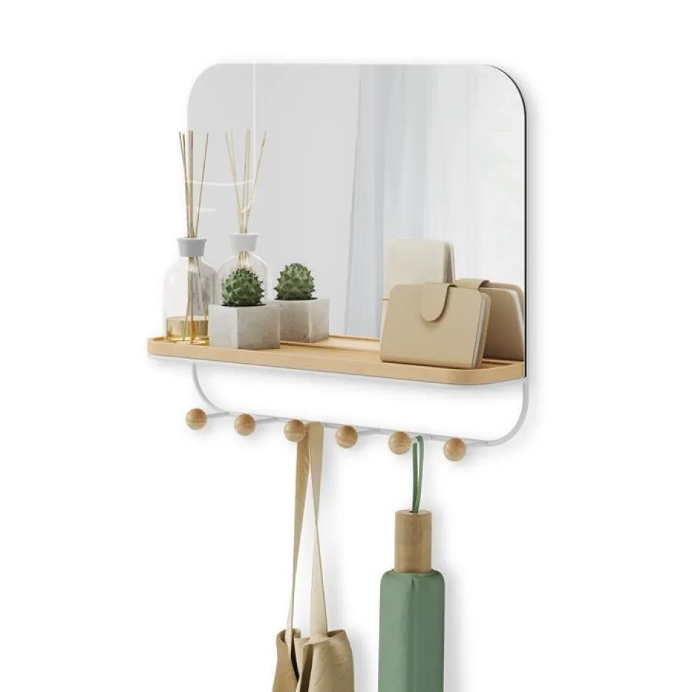 Lustro Estique połączone z półką i poręcznymi wieszakami w formie haczyków to multifunkcjonalny projekt, który idealnie odnajdzie się w Twoim przedpokoju. Ze względu na to, że całość montowana jest do ściany, pozwoli zaoszczędzić sporo miejsca nawet w niedużym mieszkaniu. Średniej wielkości lustro pozwoli przejrzeć się przed wyjściem z mieszkania, a dodatkowa półka posłuży jako miejsce na klucze, okulary i inne przedmioty, które chcesz mieć zawsze pod ręką. Dodatkowo pod lustrem zamontowane zostały haczyki, które z powodzeniem zmieszczą kurtki, szaliki i czapki. Lustro Estique to po prostu wiele funkcji zamkniętych w jednym produkcie, a do tego ubranych w piękną estetyczną formę.