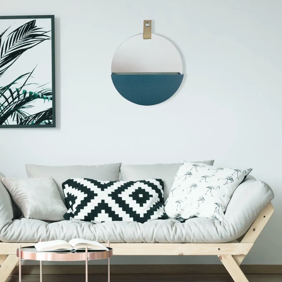 Okrągłe lustro Rangement pomoże w zorganizowaniu przestrzeni przedpokoju. Dzięki głębokiej i pojemnej półce lustro jest bardzo praktyczne. Jasnoniebieska półka w kształcie półokręgu dodaje nowoczesnego wyglądu oraz współgra z jasnobeżowym uchwytem.