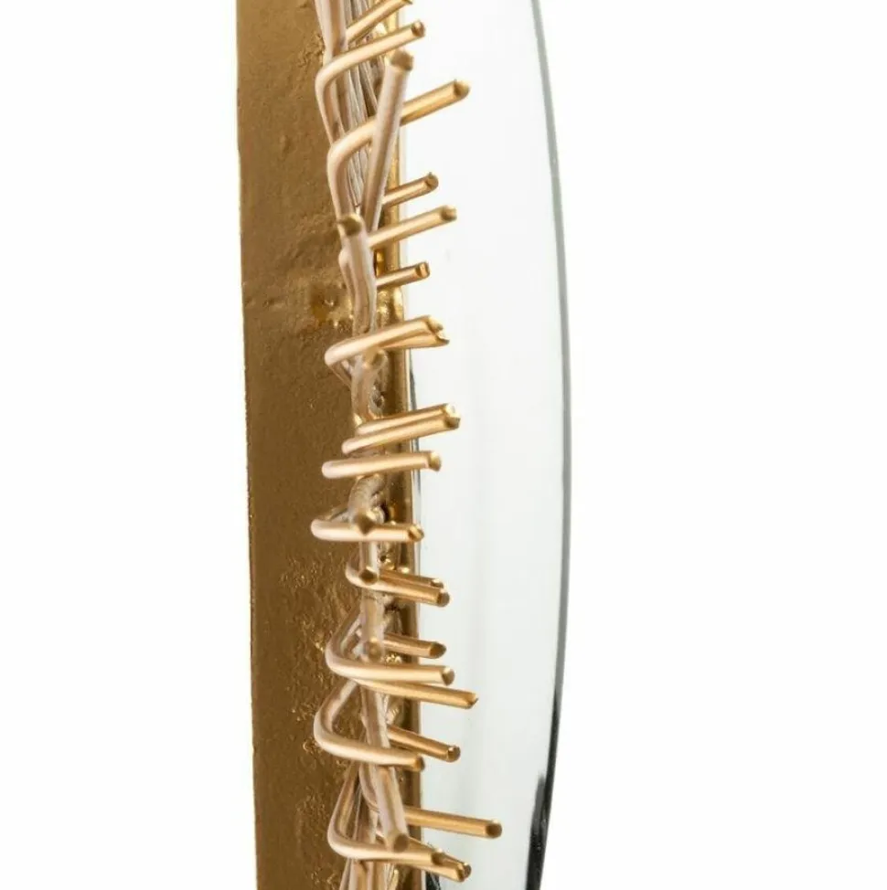 Okrągłe lustro z metalową ramą w kolorze złotym, która przypomina promienie słońca, doda nowoczesnego akcentu do pustej ściany w każdym pomieszczeniu. Rama wykonana jest z lakierowanego metalu. Natomiast tył, na którym zamontowane jest lustro oraz uchwyty montażowe to solidna płyta MDF.