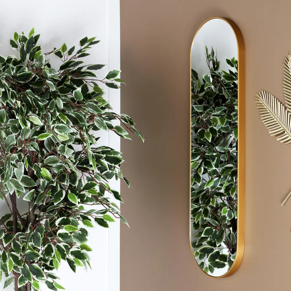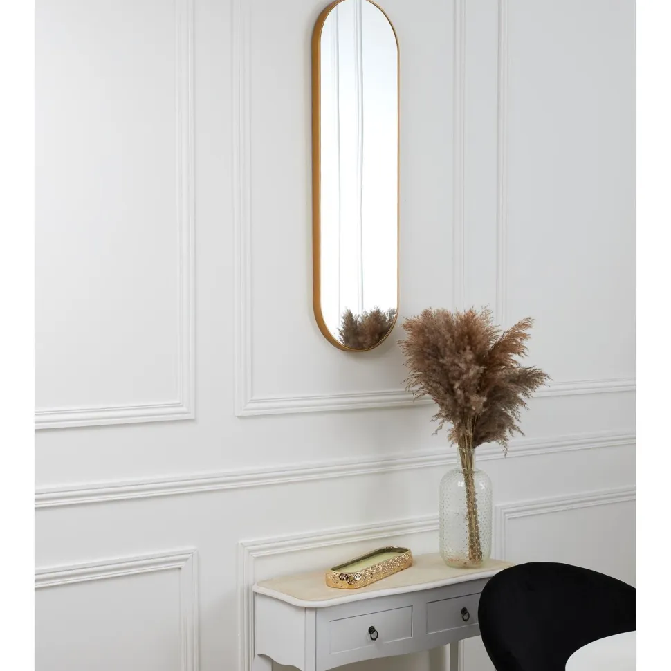 Przedstawiamy złote lustro Camomille – idealny sposób na dodanie odrobiny elegancji i uroku do Twojej łazienki lub sypialni. Dzięki oszałamiającemu złotemu wykończeniu i smukłej formie, to piękne lustro stanie się Twoim nowym ulubionym elementem akcentującym! Wykonane z wysokiej jakości tworzywa sztucznego oraz szkła, to lekkie lustro o owalnym kształciema wymiary 100×30 cmi będzie idealnie pasować do każdego wystroju w stylu boho lub glamour.