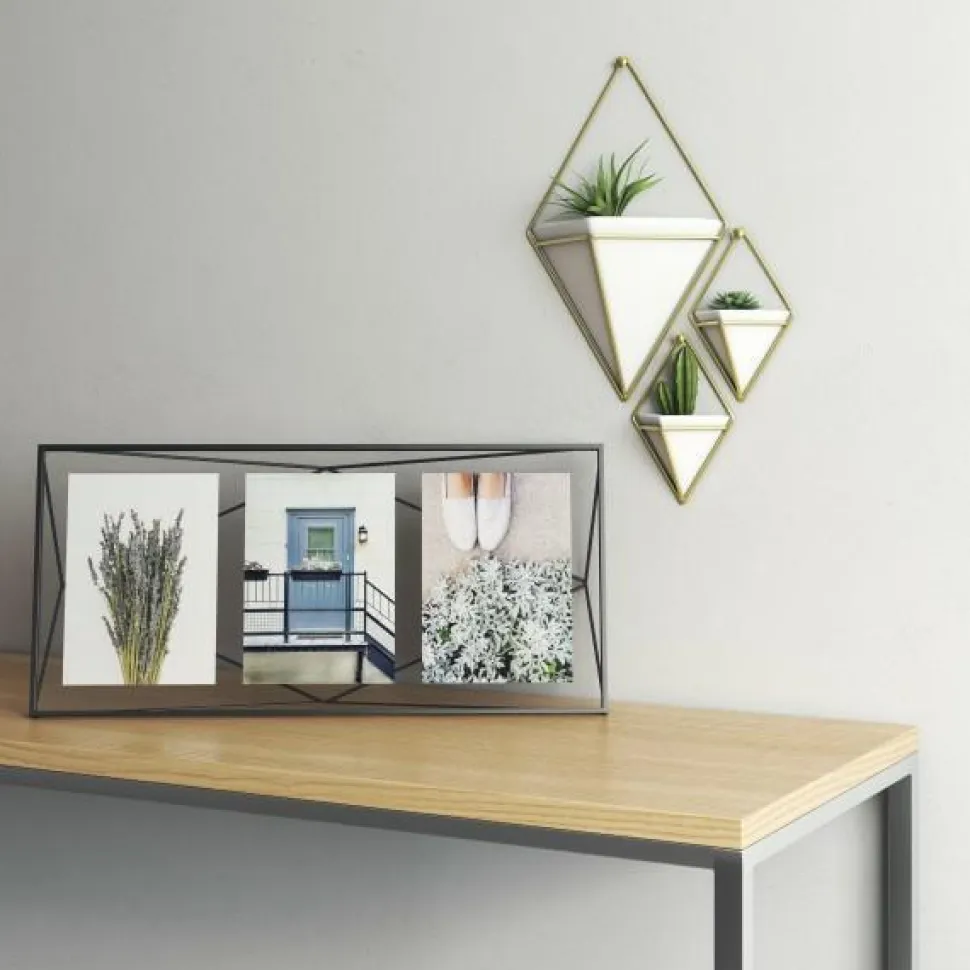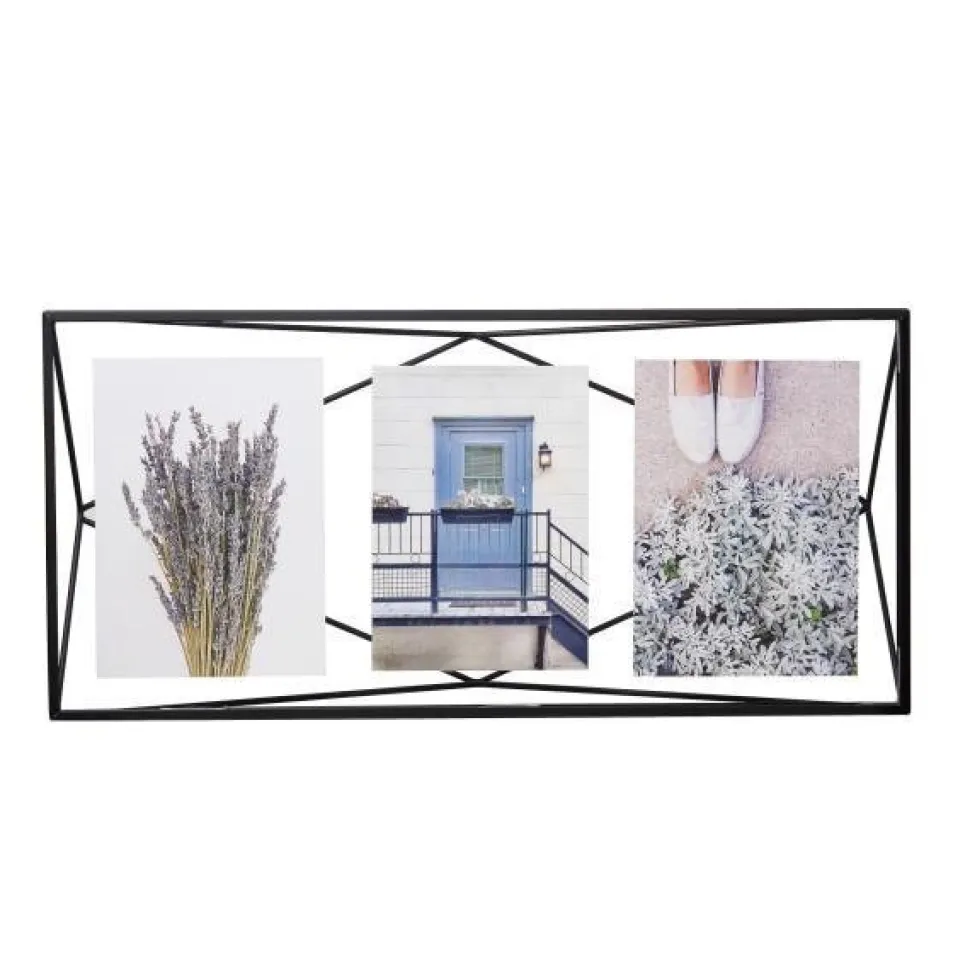 Prisma to multifunkcjonalna, elegancka ramka na zdjęcia. Wykonana jest z metalowych elementów w kolorze czarnym ułożonych w ażurowy wzór oraz dwóch szklanych tafli, między którymi umieszcza się zdjęcia. Ramka może zostać postawiona na komodzie lub stole albo powieszony na ścianie. W orientacji poziomej zmieszczą się w niej 3 zdjęcia, w pionowej – 2. Prostota i nowoczesny design sprawią, że dzięki niej dowolne pomieszczenie w Twoim domu nabierze wyjątkowego charakteru i zyska niepowtarzalny, charakterystyczny element wystroju.
