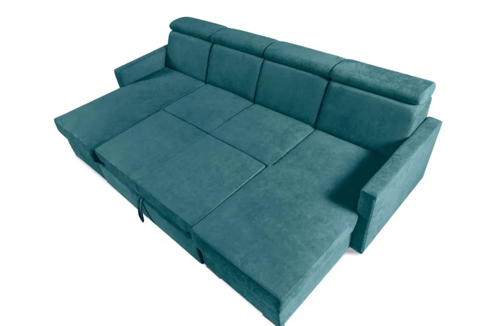 - Wyposażony w ruchome zagłówki i pojemnik na pościel, zapewnia komfort i funkcjonalność.