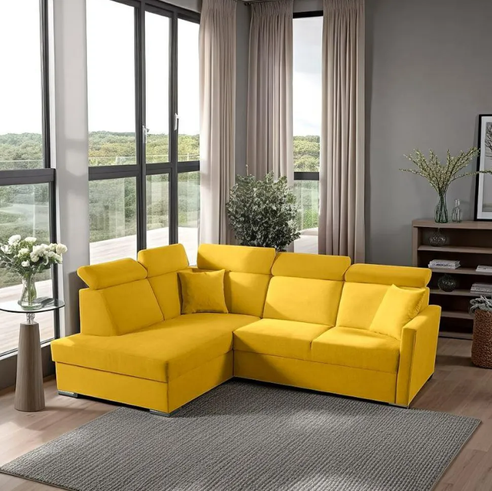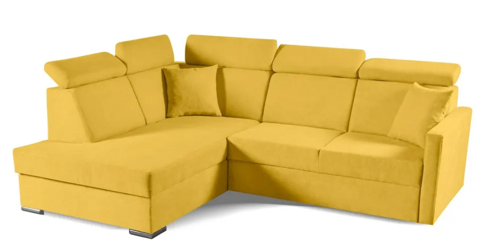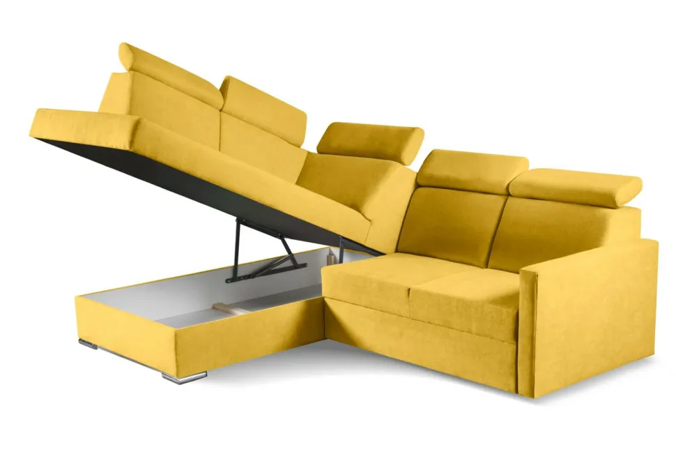 Narożnik Mils XL nie tylko pięknie prezentuje się w salonie, ale także doskonale sprawdza się w codziennym użytkowaniu. Jego siedzisko, wykonane z pianki poliuretanowej i sprężyny falistej, zapewnia niezrównany komfort podczas odpoczynku. Narożnik posiada także praktyczny pojemnik na pościel, który pozwoli Ci utrzymać porządek w swoim domu. Dodatkowym udogodnieniem są ruchome zagłówki, które można dostosować do swoich indywidualnych potrzeb.