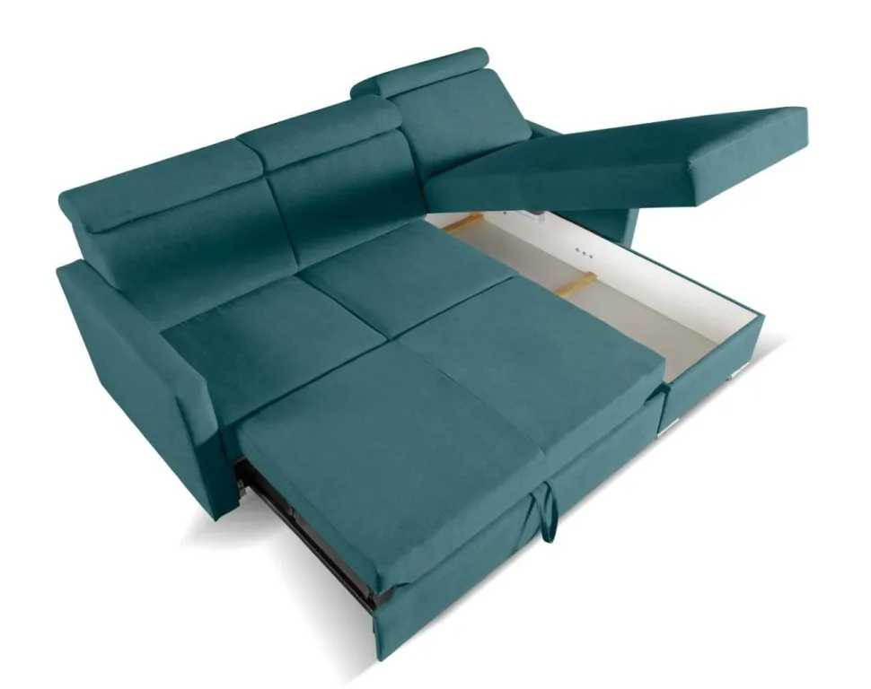 Stylowy i elegancki narożnik Mils z funkcją spania w kolorze morskim to idealne rozwiązanie dla osób ceniących komfort i funkcjonalność. Mils jest nie tylko meblem, który doda uroku każdemu wnętrzu, ale również praktycznym rozwiązaniem dla gości. Z łatwością zmienisz go z miejsca do siedzenia w komfortowe łóżko o wymiarach 120×195 cm. Dodatkowo, narożnik wyposażony jest w pojemnik na pościel, dzięki czemu zawsze będziesz miał gdzie schować zapasowe kołdry i poduszki.