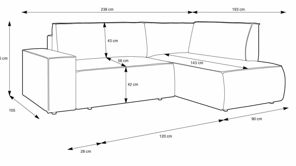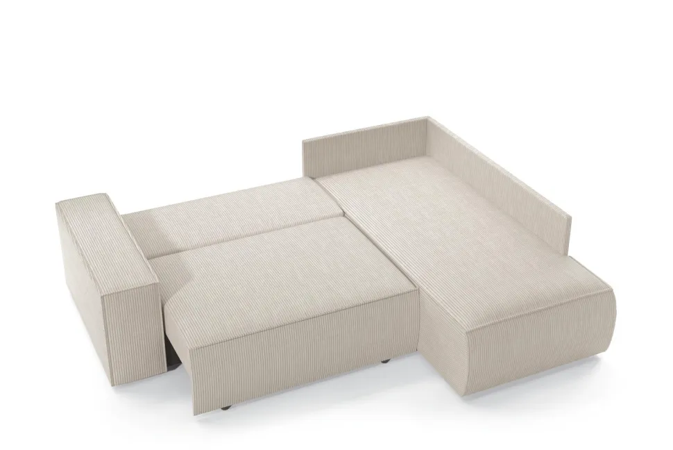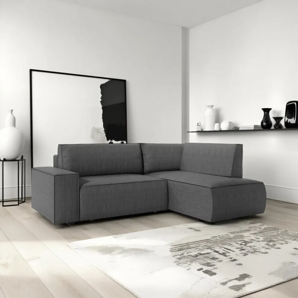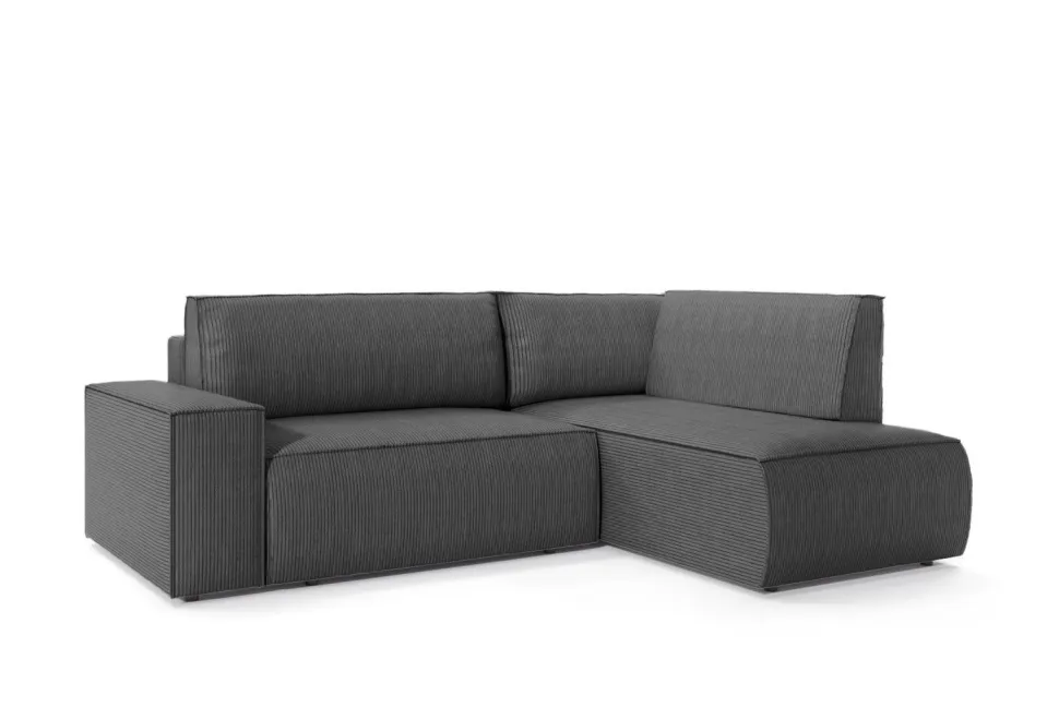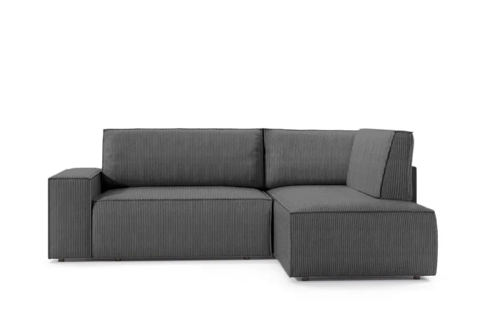 Narożnik Molde L prawy w sztruksowym szarym wykończeniu to idealne połączenie wygody i stylu. Jego minimalistyczny design sprawia, że pasuje do każdego wnętrza, a ciekawy materiał dodaje mu niepowtarzalnego charakteru. Sofę możemy łatwo rozłożyć do powierzchni spania o wymiarach 200×135 cm, co czyni go niezwykle praktycznym meblem do codziennego użytku. Dodatkowo, narożnik wyposażony jest w pojemnik na pościel, co pozwala na utrzymanie porządku w salonie.