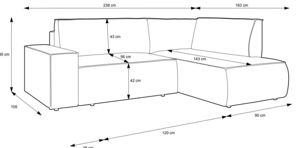 Duży narożnik Molde to połączenie ponadczasowego designu z wyjątkowym komfortem, zapewniającym relaks na najwyższym poziomie. Jego sztruksowa tkanina nadaje mu niepowtarzalnego charakteru, a minimalistyczny kształt sprawia, że doskonale wpisuje się w różne aranżacje wnętrz. Narożnik Molde ma możliwość rozkładania do powierzchni spania o wymiarach 200x135cm, co czyni go idealnym miejscem do noclegu dla gości. Dodatkowo, wyposażony jest w pojemnik na pościel, który umożliwia przechowywanie potrzebnych rzeczy w zasięgu ręki.