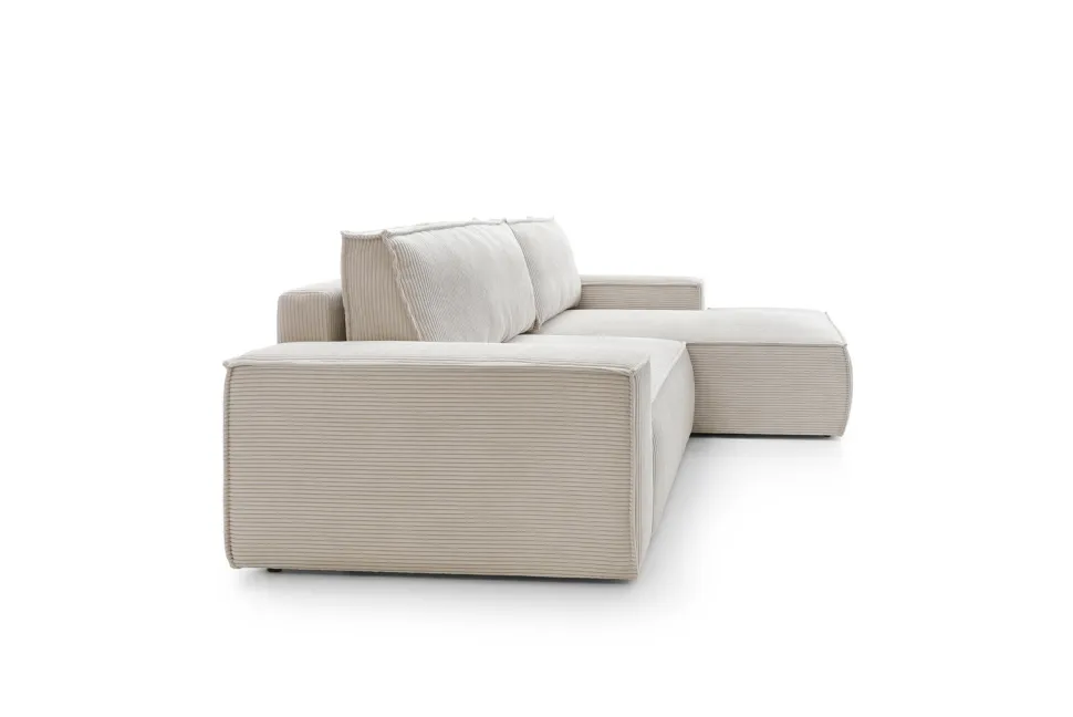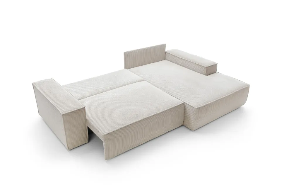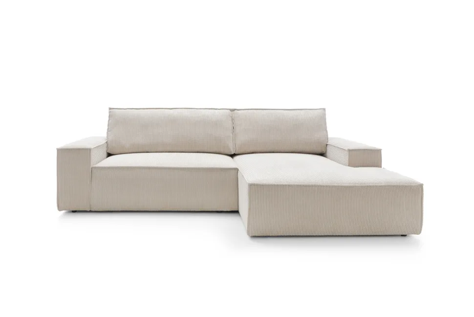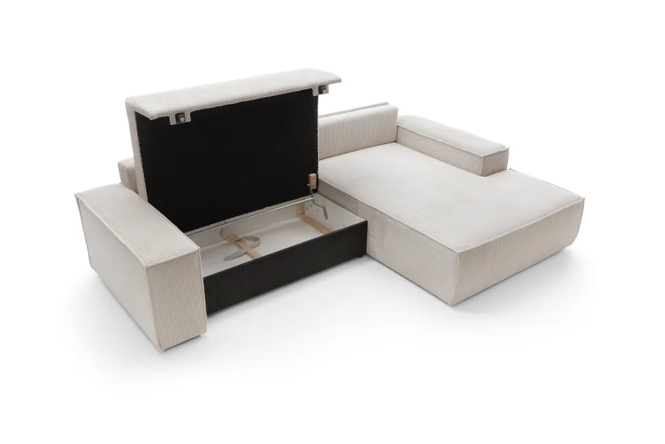 Narożnik Molde to elegancki i funkcjonalny mebel, który idealnie wpisze się w każde wnętrze. Wykonany z wysokiej jakości sztruksowej tkaniny, narożnik charakteryzuje się ponadczasowym designem i wyjątkowym komfortem użytkowania. Mebel wyposażony jest w wygodny i obszerny pojemnik na pościel, co sprawia, że idealnie sprawdzi się w małych mieszkaniach, gdzie liczy się każdy centymetr przestrzeni. Dodatkowo, narożnik posiada grubą poduszkę na szezlongu, która zapewni komfort podczas odpoczynku.