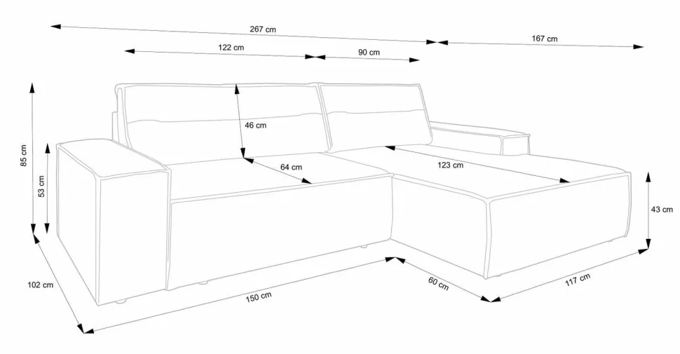 - Mebel wyposażony jest w pojemnik na pościel oraz rozkłada się do powierzchni spania 210x135cm, co czyni go niezwykle praktycznym rozwiązaniem w małych mieszkaniach.