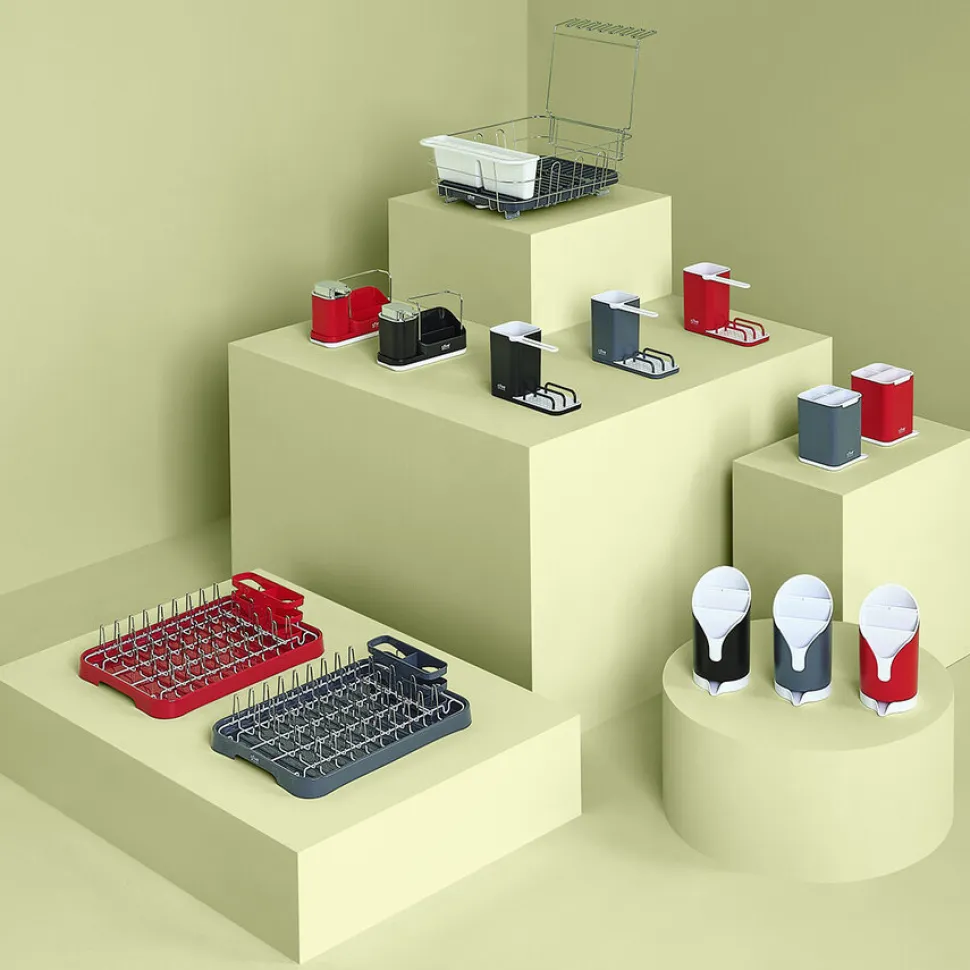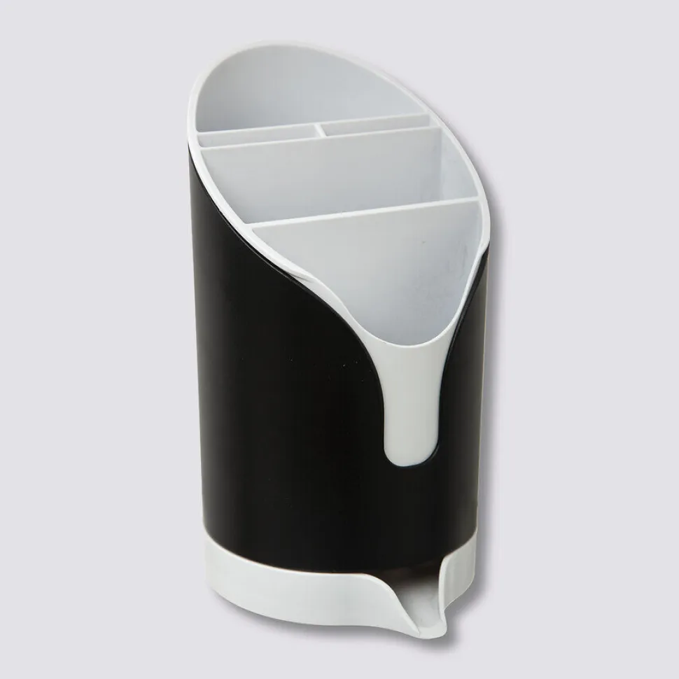 - Dzięki różnym przegródkom i ściętemu kształtowi, ociekacz pomieści duże naczynia, noże oraz średnie i małe sztućce w uporządkowany sposób