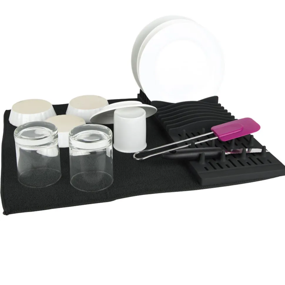 Dzięki suszarce do naczyń Airy można szybko i łatwo wysuszyć dużą ilość naczyń.Wykonana jest z przewiewnej i chłonnej matyoraz podpórki z tworzywa, dzięki czemu jestłatwa do przechowywania. Miękki i chłonny materiał pomaga szybko osuszyć naczynia, zapobiegając powstawaniu plam i smug po wodzie. To akcesorium do naczyń jest idealne dla tych, którzy mają ograniczoną przestrzeń na blacie w kuchni, ponieważnie zajmuje dużo miejsca, a jednocześnie jest w stanie wysuszyć dużą ilość naczyń.