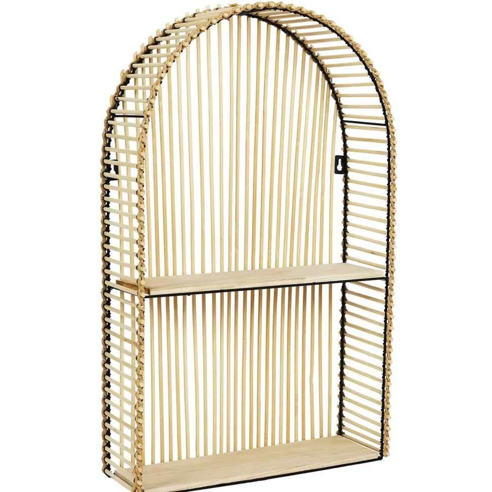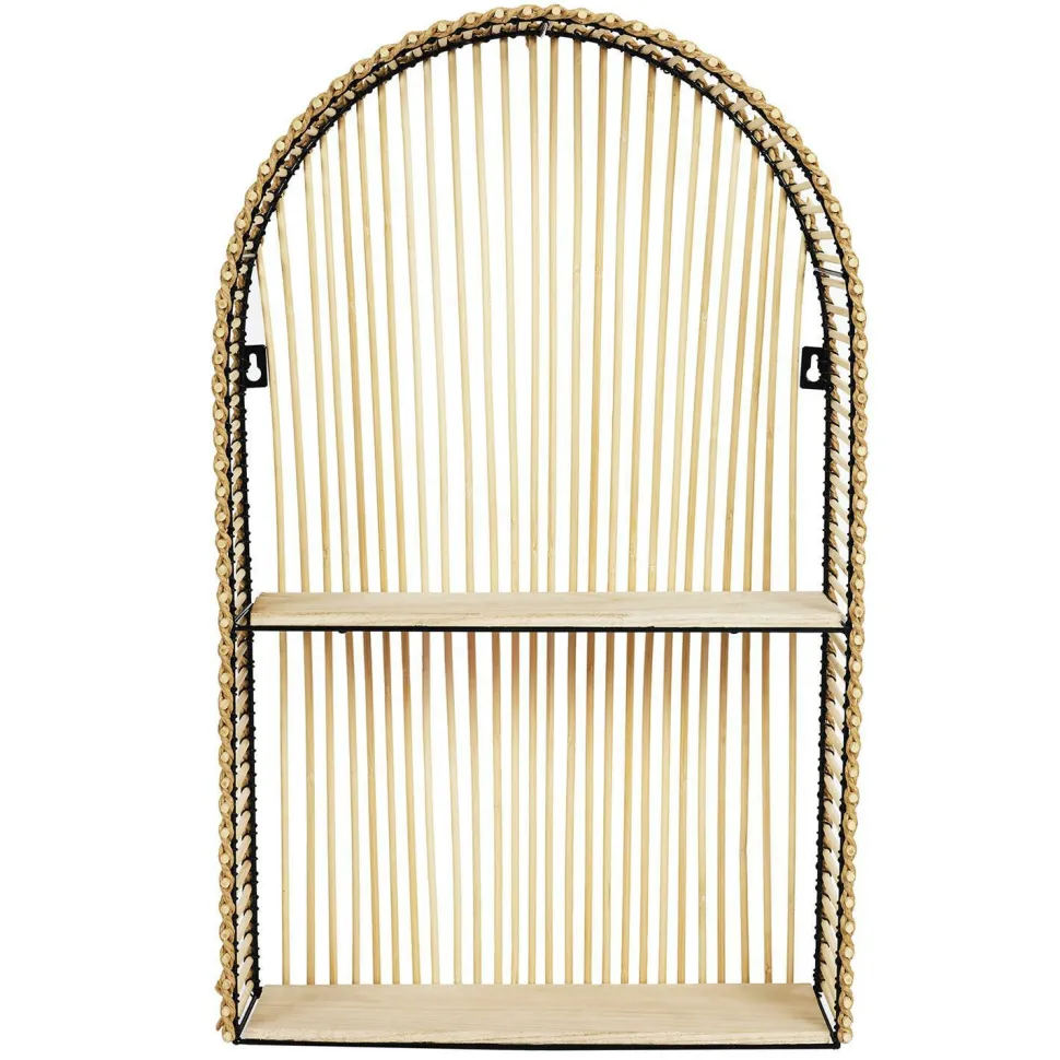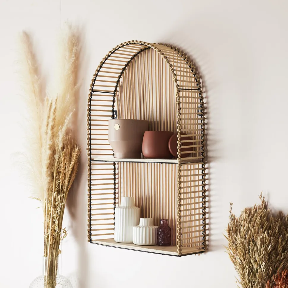 Półka Balito połączenie metalowego szkieletu, drewnianych półek oraz rattanu, który został ozdobnie przepleciony. Produkt wyposażony został w dwie półki na których można ustawić np. świeczki, zdjęcia czy wazony.