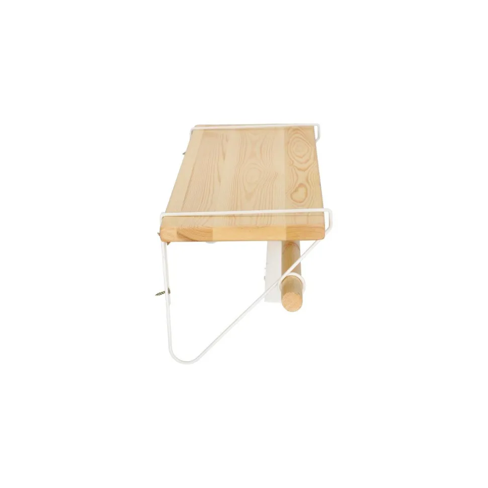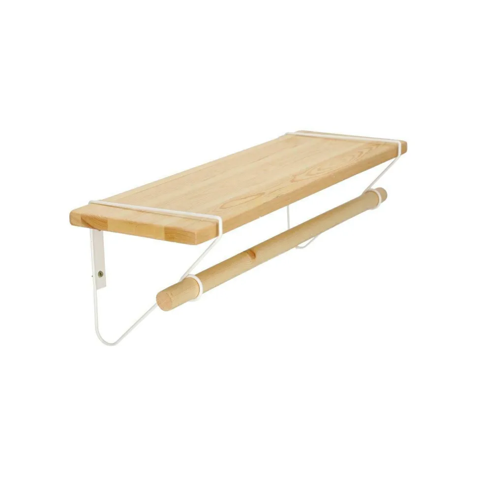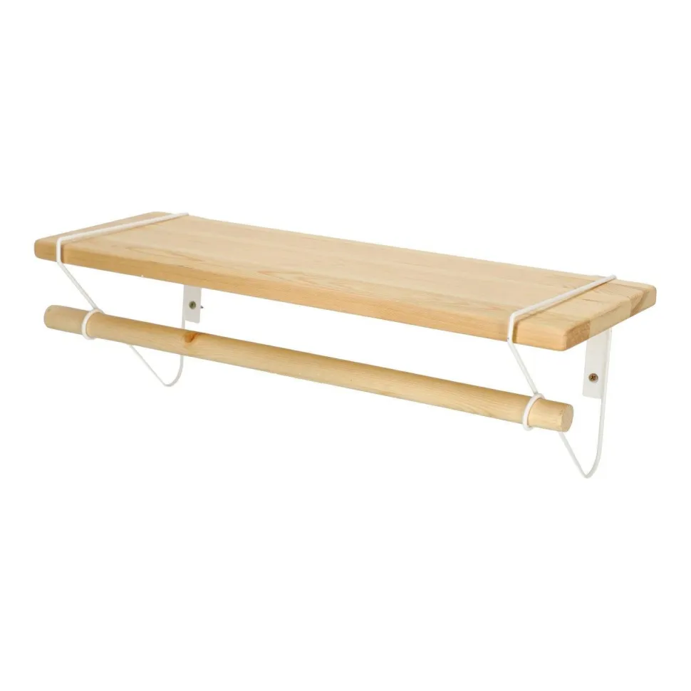 Drewniana półka o białych metalowych wspornikach to idealny wieszak do jasnego wnętrza w stylu skandynawskim. Półka Bish została wykonana z naturalnego drewna połączonego z białymi elementami. Półka posiada dodatkowy drewniany drążek, na którym możemy wieszać wieszaki z kurtkami. Półka sprawdzi się w niewielkim przedpokoju. Wymiary opakowania: 6x17x63 cm