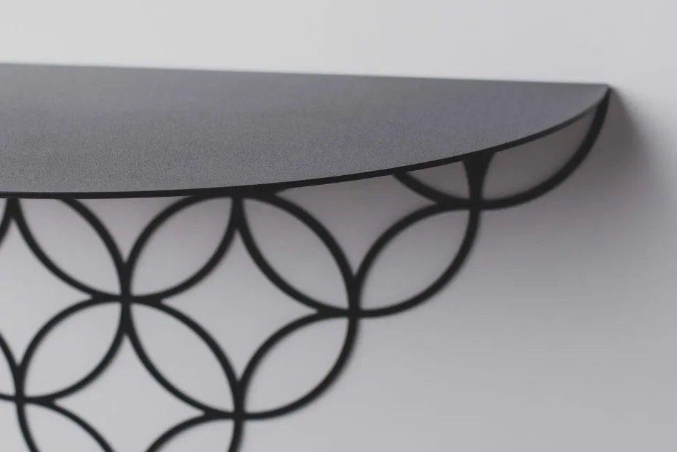 Całość, nieprzemijalność, nieskończoność. Wieszaki i półki z serii Holo to hołd dla koła – najprostszej i zarazem najbardziej złożonej figury geometrycznej. Produkty z tej serii są ponadczasową dekoracja każdej przestrzeni. Wycinany laserowo, stalowy, malowany proszkowo. Waga: 1kg