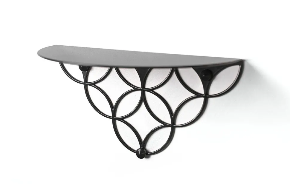 Całość, nieprzemijalność, nieskończoność. Wieszaki i półki z serii Holo to hołd dla koła – najprostszej i zarazem najbardziej złożonej figury geometrycznej. Produkty z tej serii są ponadczasową dekoracja każdej przestrzeni. Wycinany laserowo, stalowy, malowany proszkowo. Waga: 0,6kg