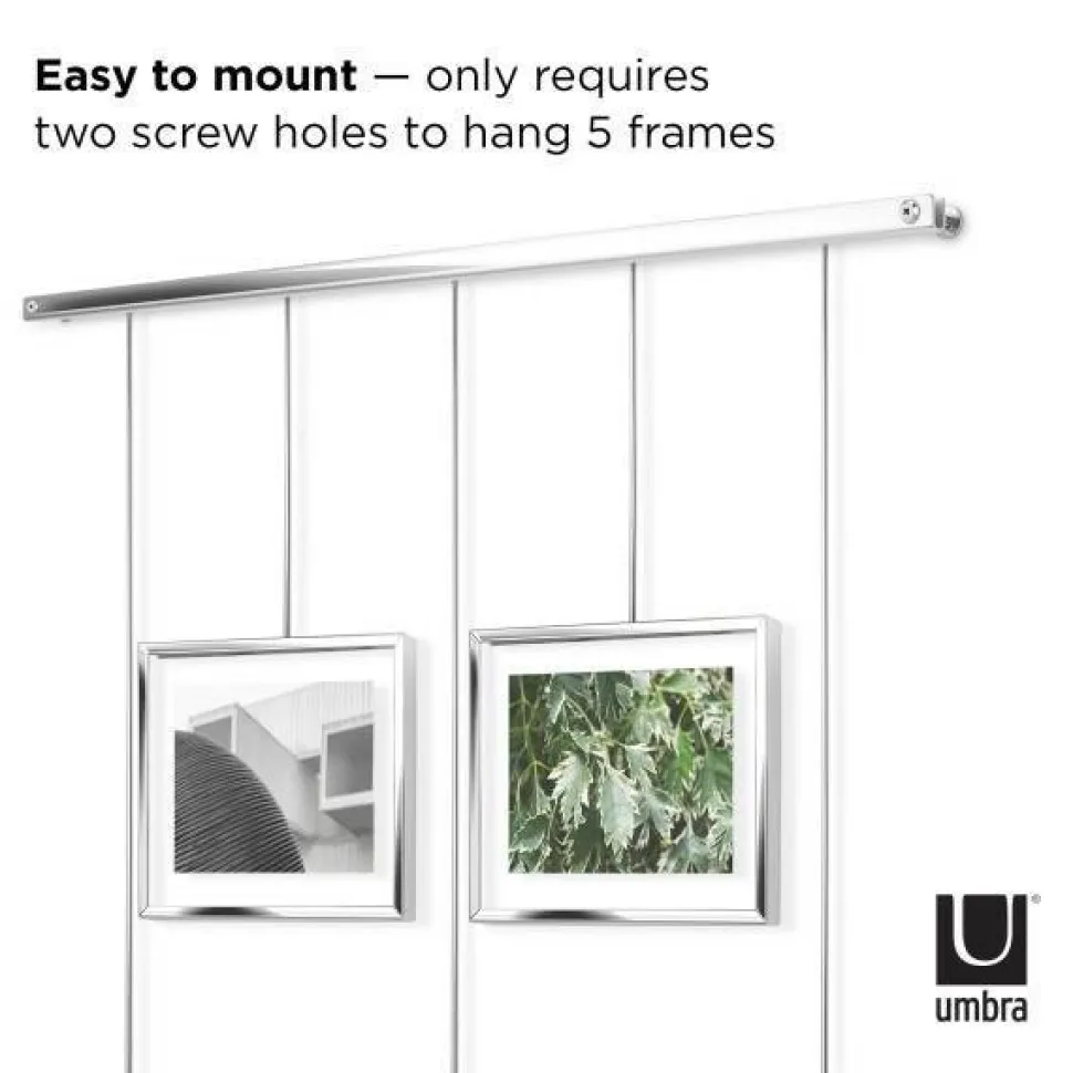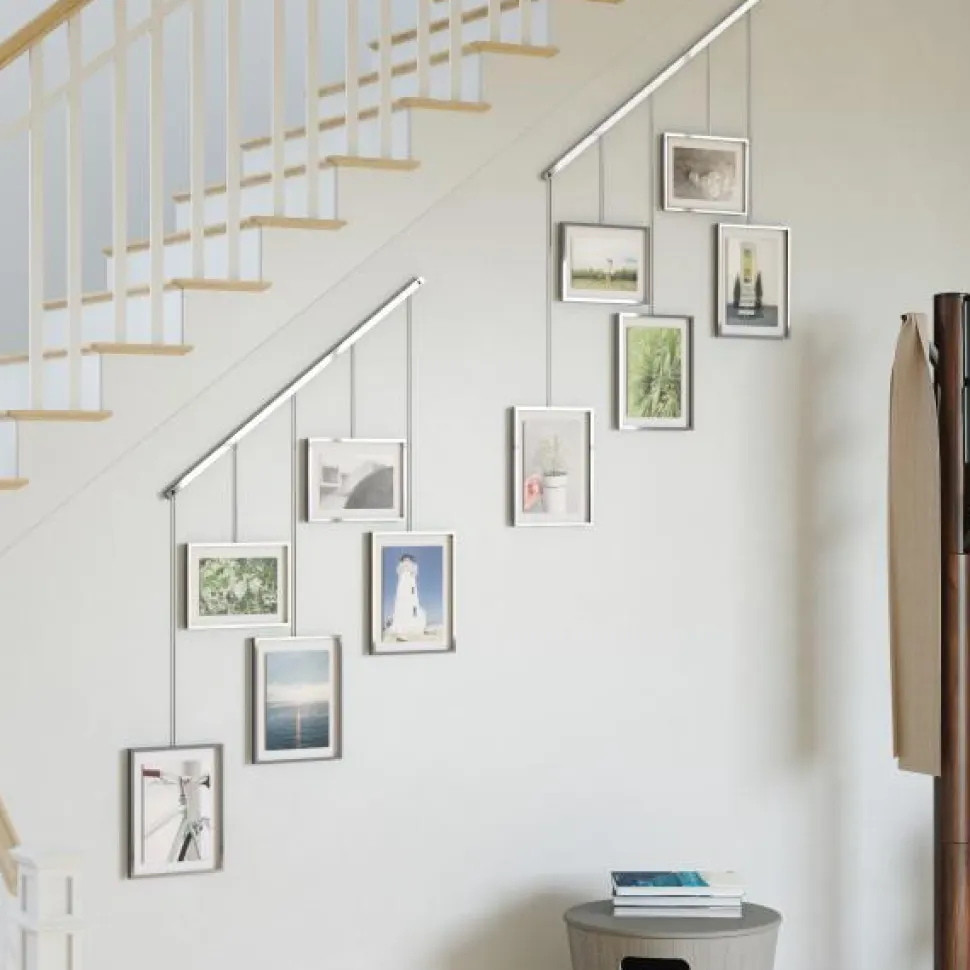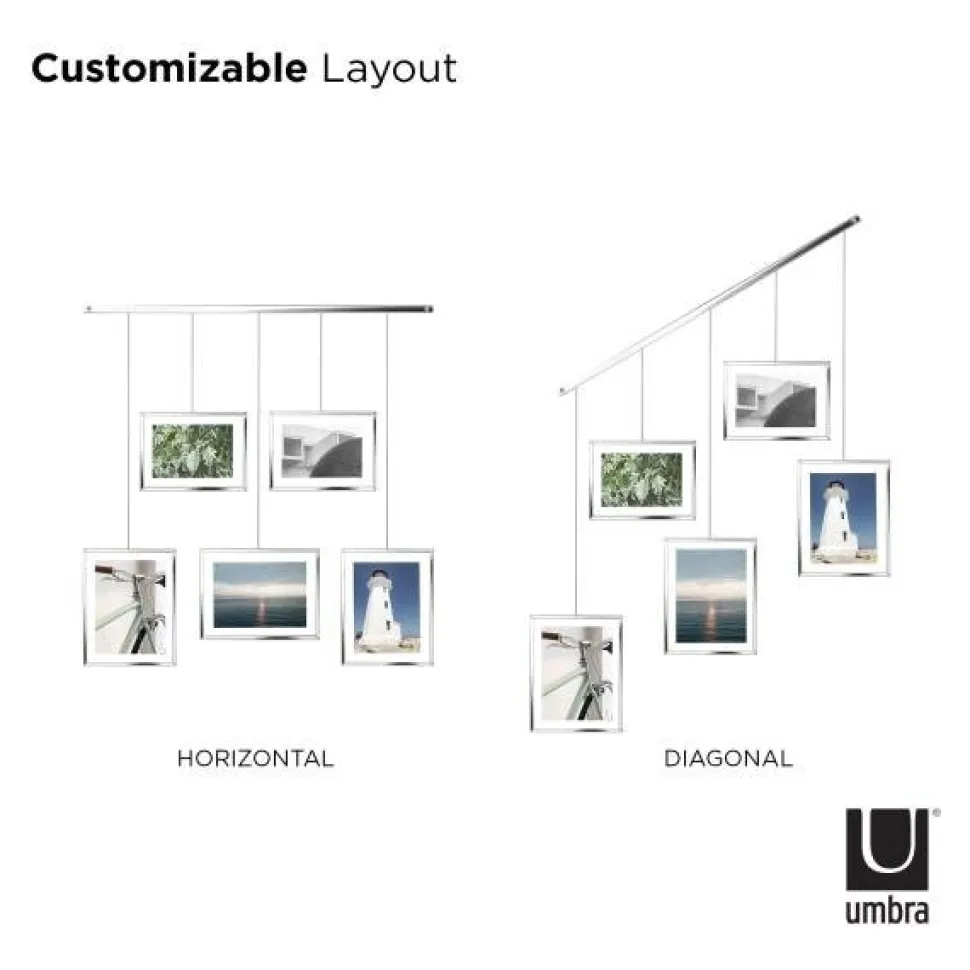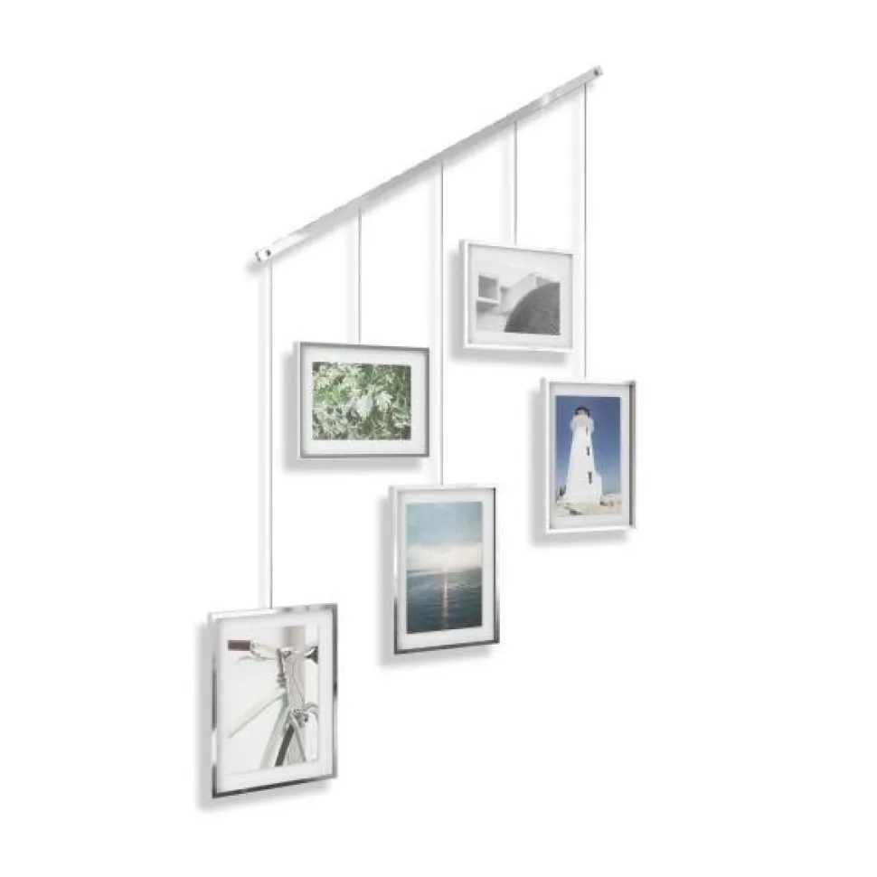 Wieszanie i poziomowanie wielu ramek do zdjęć na ścianie może być kłopotliwe. Idealnym rozwiązaniem na powieszenie wielu ulubionych zdjęć jest ramka Exhibit. Posiada ona listwę ze szczotkowanego metalu z klipsami i wspornikami do trzymania pięciu ramek na zdjęcia o różnych rozmiarach. Dzięki Exhibit możemy tworzyć ciekawe kolaże zdjęć, a wszystko to przy jednoczesnym zmniejszeniu uszkodzeń ścian. Wsporniki z ramkami są zawieszone na listwie, co umożliwia ich przesuwanie w celu tworzenia różnych układów zdjęć. Jego elastyczne właściwości zawieszenia w poziomie sprawiają, że Exhibit jest doskonałym dodatkiem do wieszania na ukos np. przy schodach. W ramki możemy umieścić zdjęcia maksymalnie o wymiarach 10x15cm oraz 13x18cm.