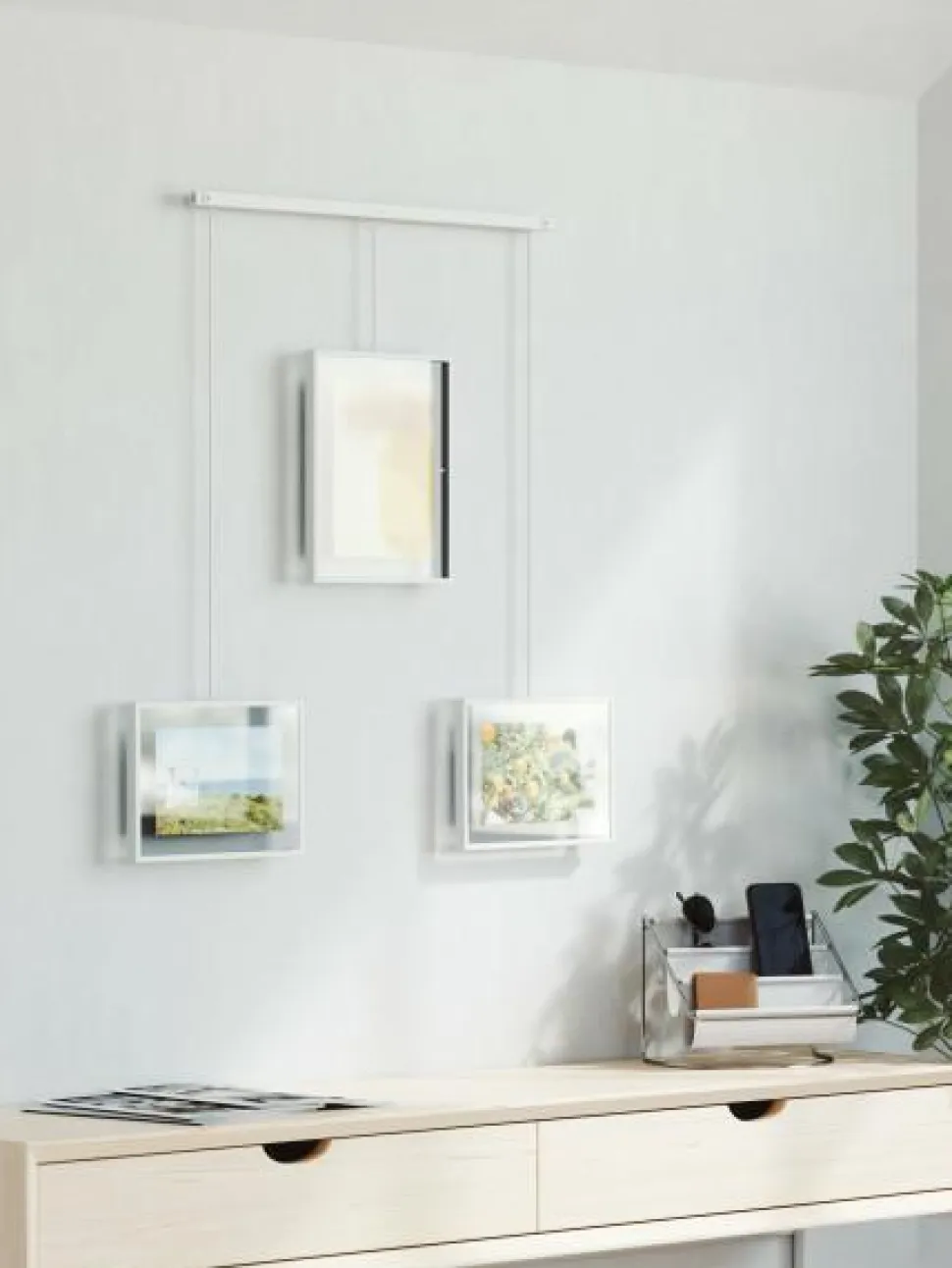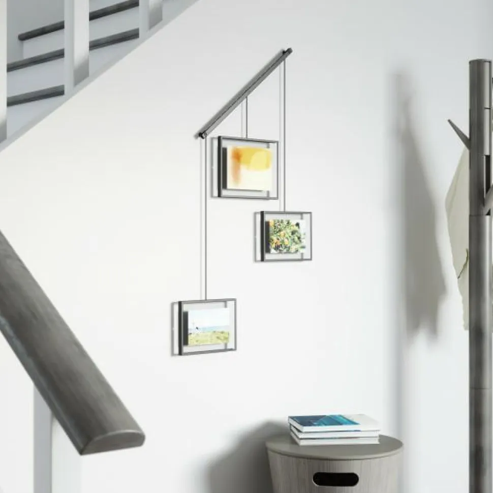 Wieszanie i poziomowanie wielu ramek do zdjęć na ścianie może być kłopotliwe. Idealnym rozwiązaniem na powieszenie wielu ulubionych zdjęć jest ramka Exhibit. Posiada ona czarną metalową listwę z klipsami i wspornikami do trzymania trzech ramek na zdjęcia o różnych rozmiarach. Dzięki Exhibit możemy tworzyć ciekawe kolaże zdjęć, a wszystko to przy jednoczesnym zmniejszeniu uszkodzeń ścian. Wsporniki z ramkami są zawieszone na listwie, co umożliwia ich przesuwanie w celu tworzenia różnych układów zdjęć. Jego elastyczne właściwości zawieszenia w poziomie sprawiają, że Exhibit jest doskonałym dodatkiem do wieszania na ukos np. przy schodach. Zestaw zawiera dwie ramki do zdjęć 10×15 i jedną 13x18cm.Waga: 1,4 kg