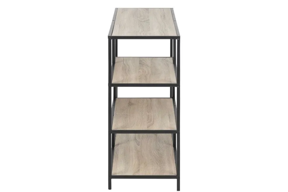 Regał Seaford V to prosty, ale jednocześnie stylowy mebel, który będzie pasować do wnętrz nowoczesnych, industrialnych i w stylu skandynawskim. Podstawa wykonana jest z malowanego proszkowo metalu w kolorze czarnym. Pięć nieregularnie rozmieszczonych półek z płyty MDF zostało pokrytych laminatem w kolorze naturalnego jasnego dębu. Nogi zakończone są gumowymi elementami, które stabilizują całość i zapobiegają przesuwaniu się. Dzięki zastosowaniu wysokiej jakości materiałów regał jest wytrzymały i odporny na uszkodzenia mechaniczne. Sprawdzi się w salonie, sypialni, a także w pokoju młodzieżowym. Jest to praktyczne i ciekawe wizualnie rozwiązanie, które zadowoli miłośników minimalizmu i współczesnego designu.