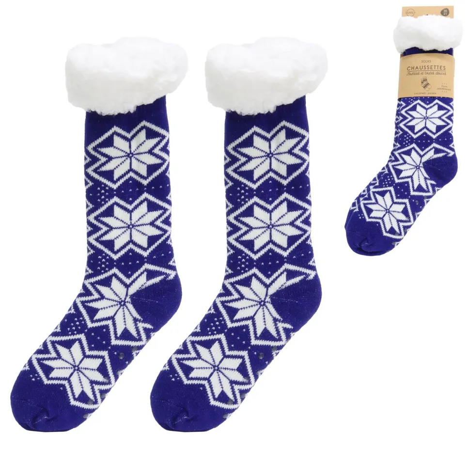 Skarpety damskie zimowe śnieżynki rozmiar 36-41 granatowe to produkt marki Intesi, która gwarantuje najwyższą jakość wykonania. Antypoślizgowe elementy na podeszwie skarpet zwiększają bezpieczeństwo podczas noszenia, dzięki czemu są idealne do użytku domowego, na przykład podczas relaksu na kanapie lub podczas porannego spaceru po domu. Miękki, futerkowy mankiet skarpet zapewnia dodatkowy komfort termiczny, dzięki czemu są idealne na chłodne, zimowe dni.